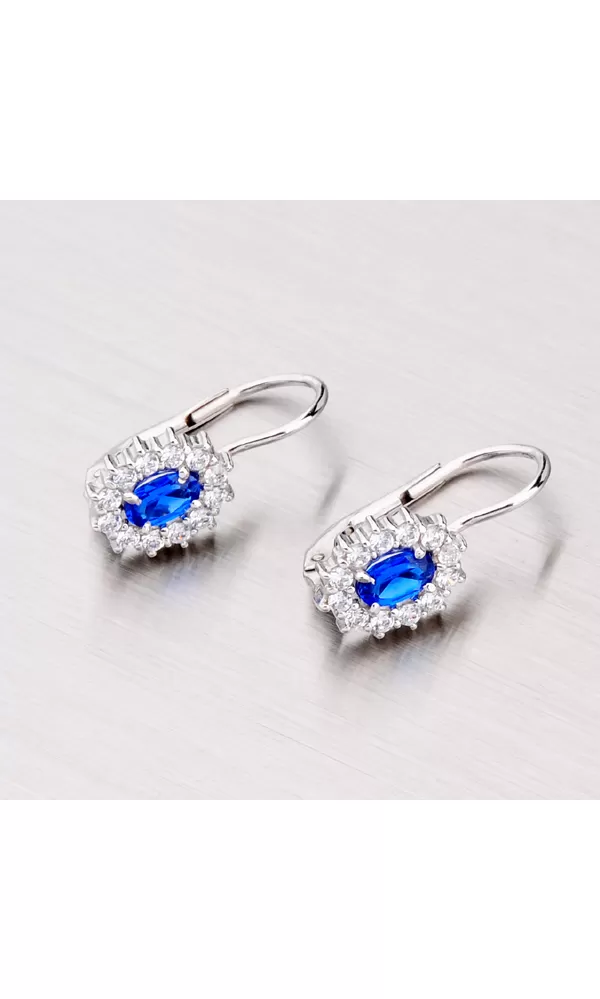Dámske náušnice s oválnymi modrými syntetickými zafírmi, ktoré sú dookola vysadené drobnými bielymi zirkónmi sú vyrobené z bieleho… Celý popis