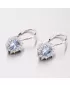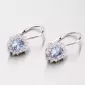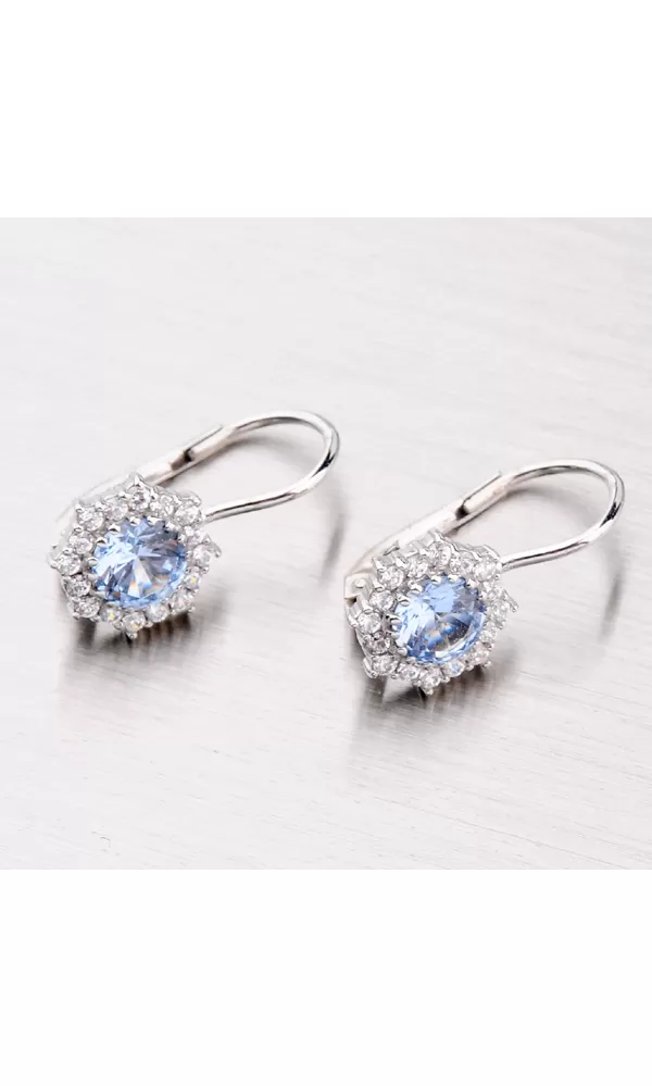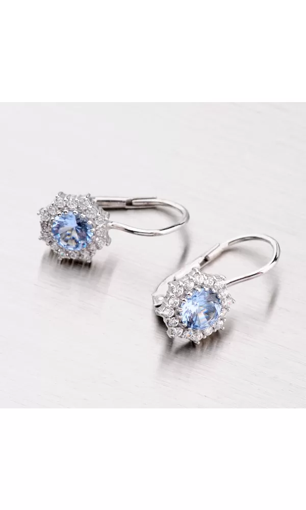 Žiarivé dámske náušnice Vás uchvátia svojim dizajnom. Veľký zirkón je v nádhernej farbe akvamarínu a menšie zirkóny sú v bielej farbe. Budú sa Vám tak tieto náušnice hodiť ako na spoločenské udalosti, tak na každodenné nosenie. Dámske náušnice vyrobené z bieleho štrnásťkarátového zlata 585/1000 v lesklej povrchovej úprave s klasickým zapínaním na klapky.