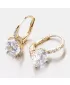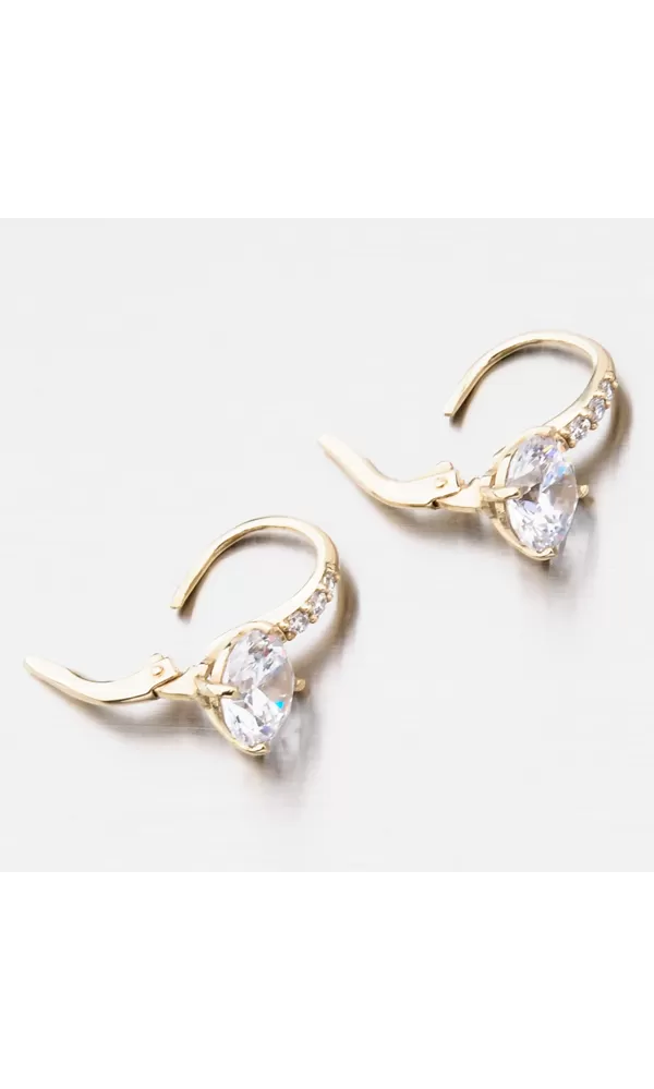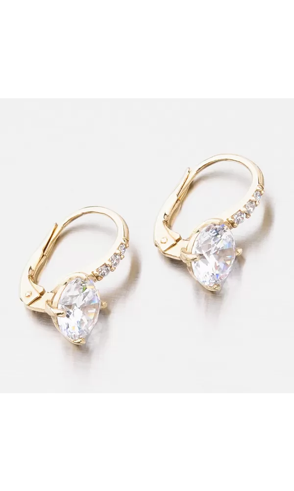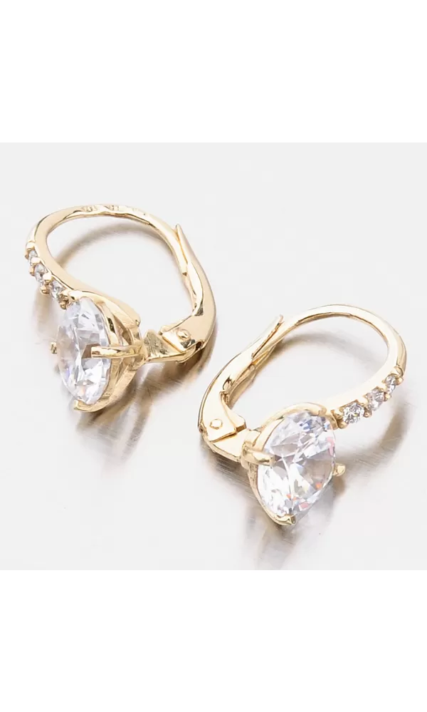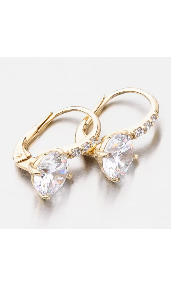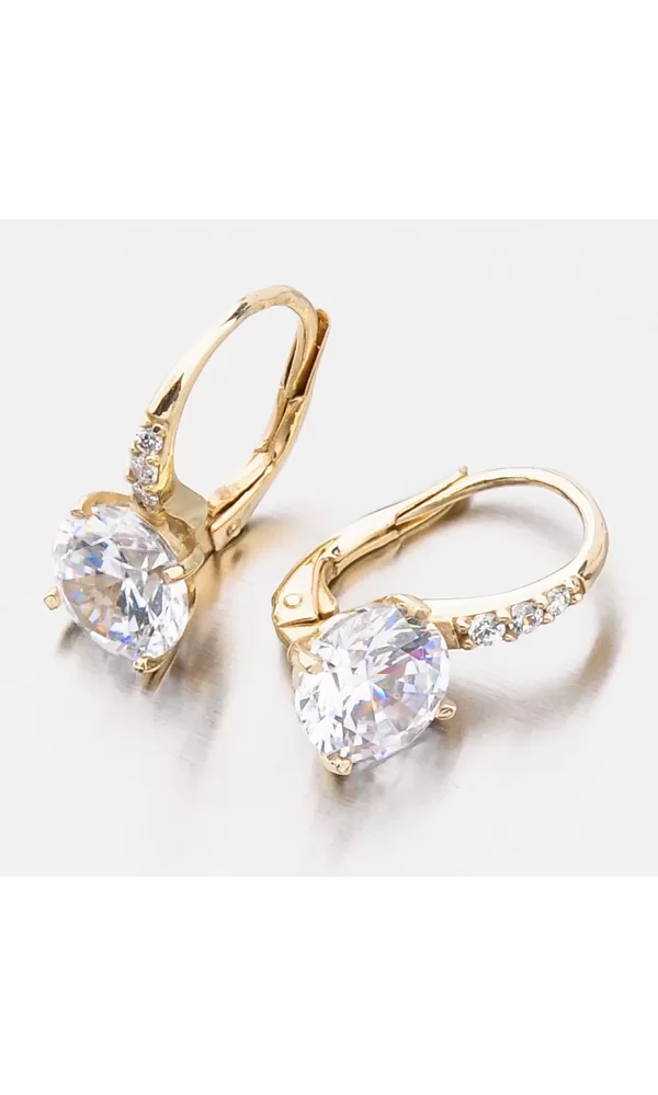 Milujete zářivé šperky? Tak to vás okouzlí tyto luxusní náušnice, které zdobí prvotřídní zirkony. Menší zirkony jsou vsazeny v konstrukci náušnic a jeden velký zirkon, který je dominantou náušnic je uchycen čtyřmi krapnami. Zirkony jsou vybroušeny v briliantovém brusu, který jim dodává brilanci pravých diamantů. Zlaté náušnice jsou velmi pohodlné a bezpečné a to díky zapínání na klapku.