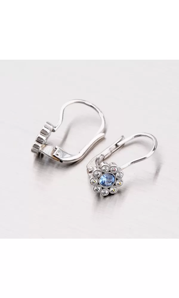 Dámske náušnice okrúhleho tvaru s modrým zirkónom, ktorý je dookola vysadený drobnými bielymi zirkónmi. Náušnice sú vyrobené z bieleho… Celý popis