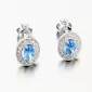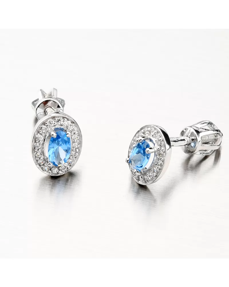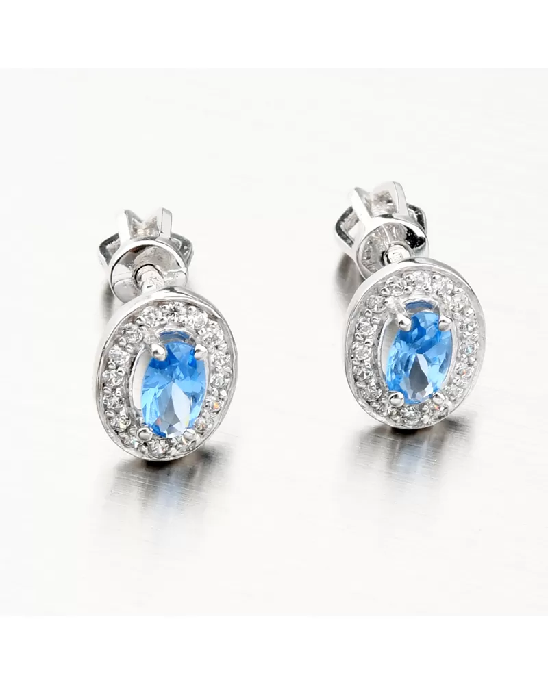 Jednoduché, ale přesto zářivé a výrazné zlaté náušnice. Náušnice zdobí oválný syntetický akvamarín, který je usazen pomocí čtyř krapen. Poté kolem celého obvodu jsou osazeny bílé kulaté zirkony. Zirkony jsou briliantového brusu, který zajišťuje maximální brilanci vybroušených facet, dokonale odráží světlo a neuvěřitelně září z každého úhlu pohledu.