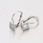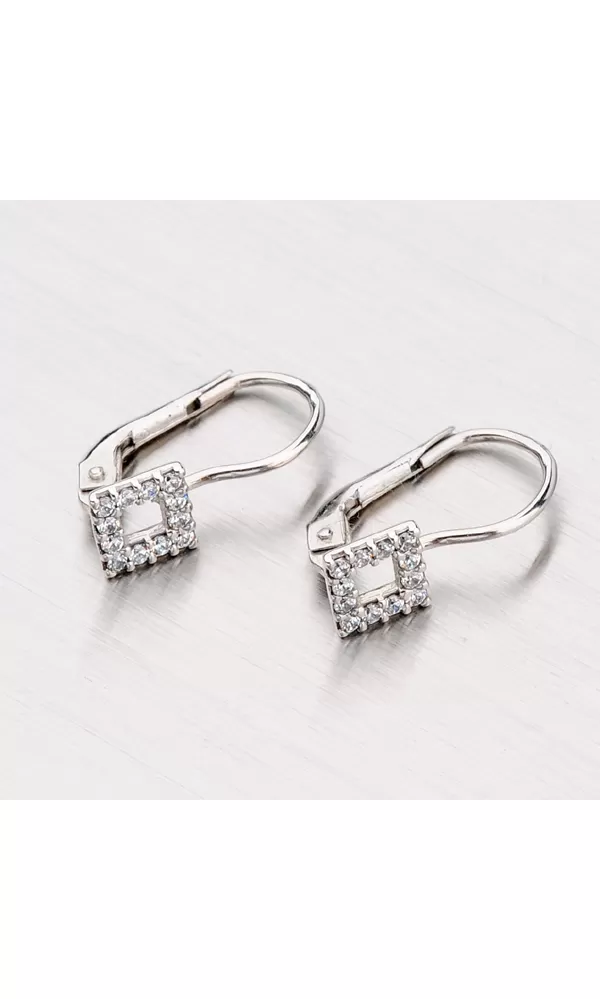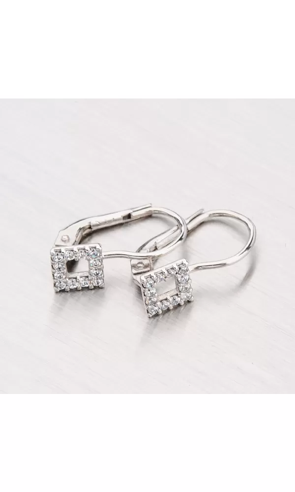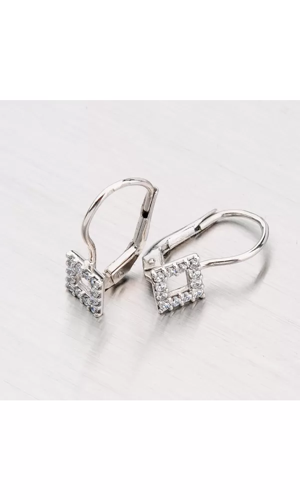Luxusné dámske náušnice so zirkónmi v tvare štvorčeka sú vyrobené z bieleho štrnásťkarátového zlata 585/1000 v lesklej povrchovej úprave. Náušnice majú klasické zapínanie na klapku.