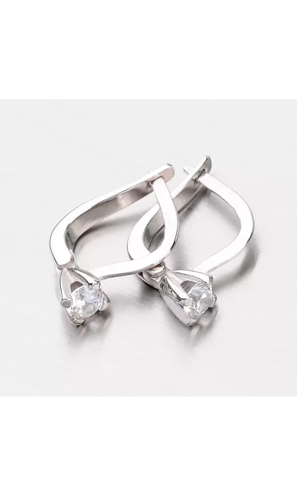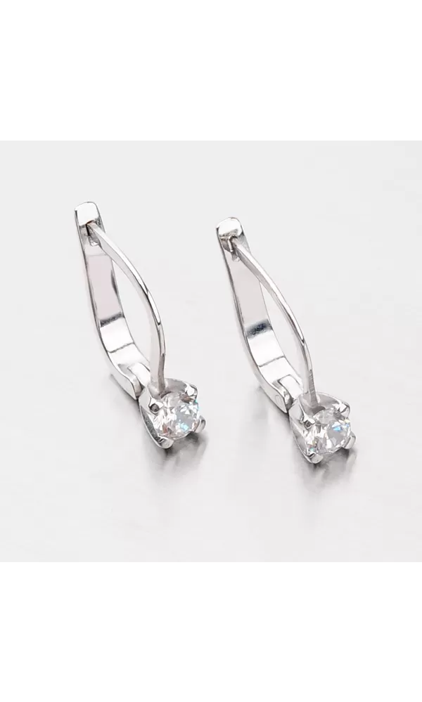 Jednoduché visiace náušnice vyrobené z bieleho štrnástich karátového zlata s rýdzosťou 585/1000 sú osadené žiarivými zirkónmi v bielej farbe. Náušnice majú lesklý povrch a zapínajú sa na pasívny patent. Náušnice zaručene potešia každú slečnu.
