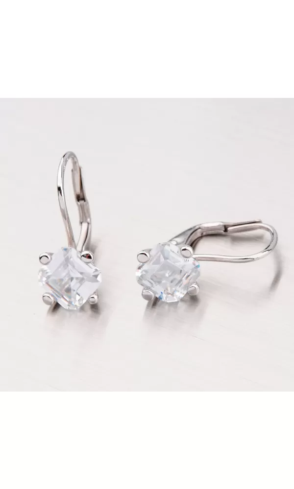 Náušnice sú vyrobené z bieleho štrnásťkarátového zlata 585/1000 v lesklej povrchovej úprave s jedným väčším hranatým bielym zirkónom. Náušnice majú… Celý popis