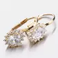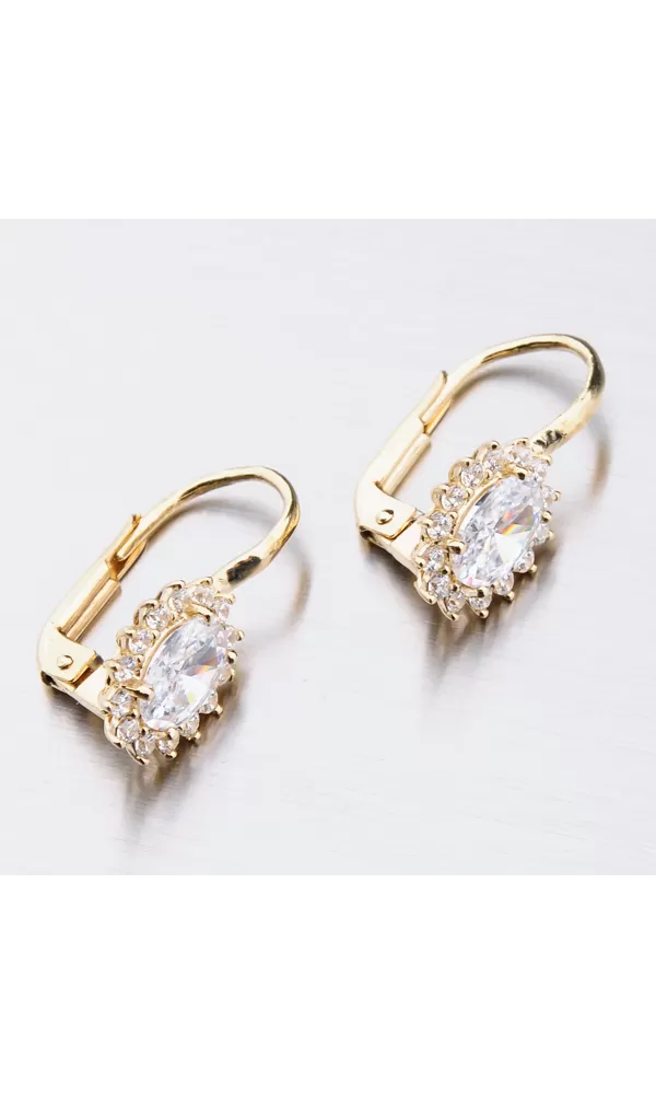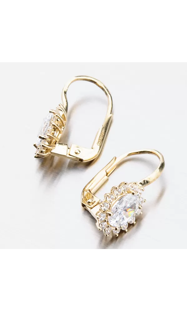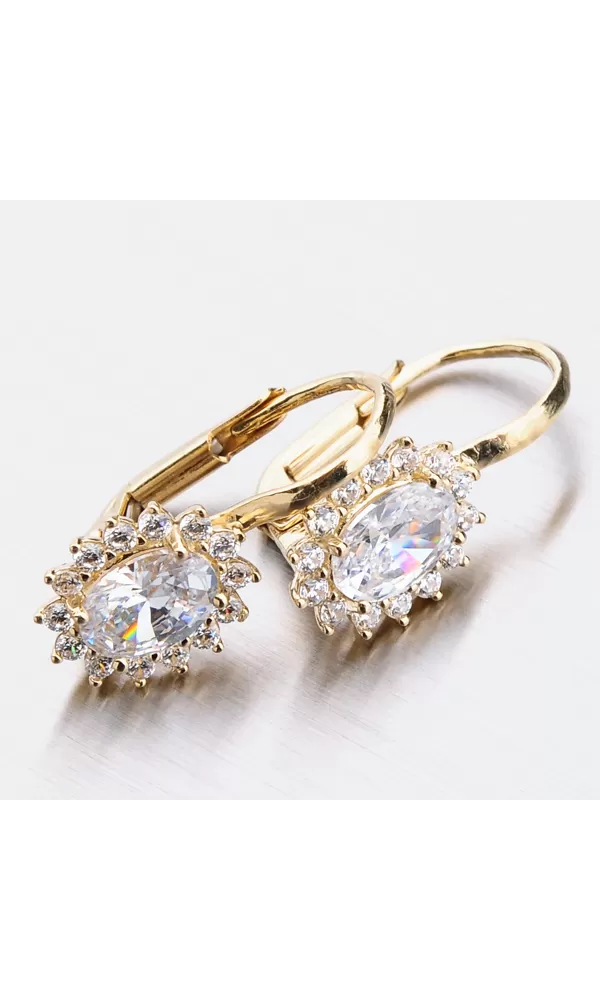 Rozšiřte svou šperkovnici o další zářivý šperk. Tyto náušnice vás oslní dokonalou září zirkonů. Náušnice jsou tvořeny velkým zirkonem vsazeným uprostřed, který je broušen do oválného tvaru. Kolem tohoto oválného zirkony jsou vsazeny menší neméně zářivé zirkony. Snad každá ženy miluje zářivé šperky a tyto náušnice opravdu zářivé jsou. Proto neváhejte a pořiďte si tento šperk.