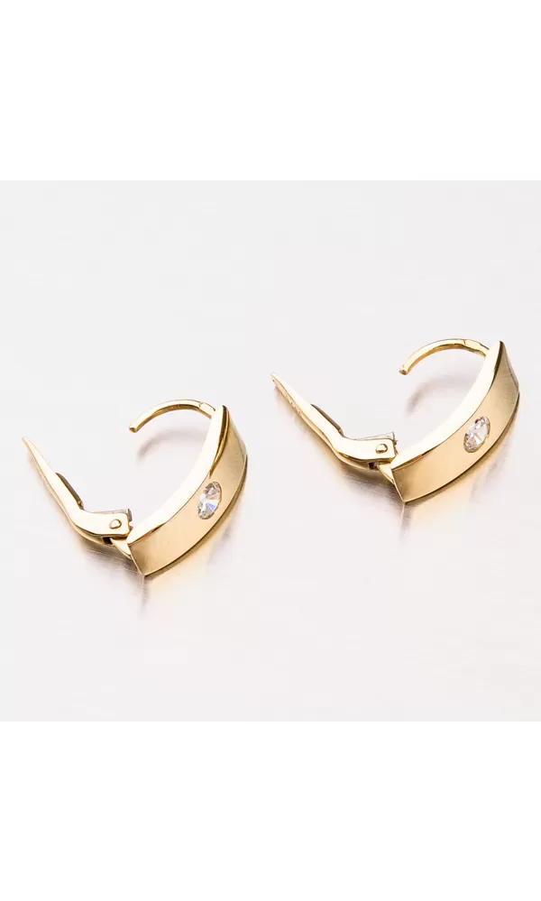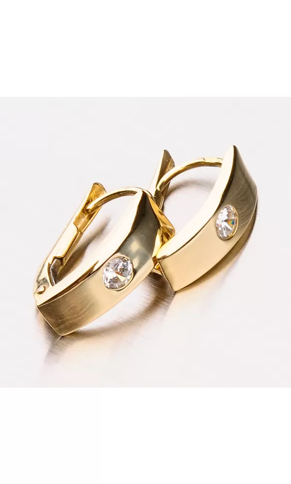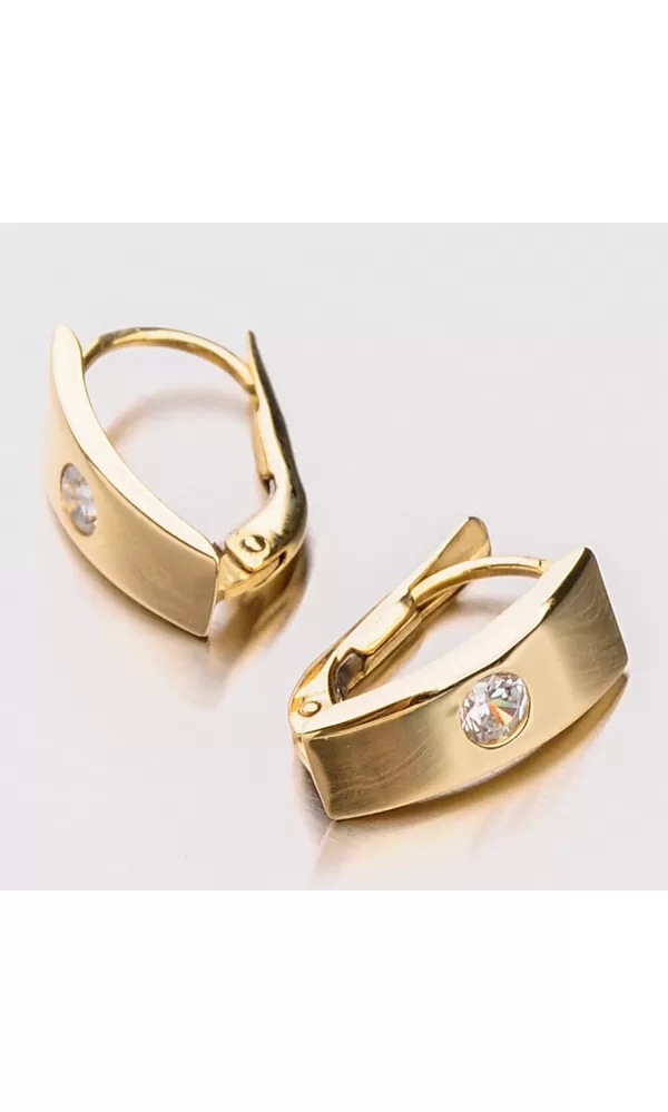 Decentné dámske náušnice ako stvorené na bežné nosenie sú vyrobené zo žltého zlata s rýdzosťou 585/1000 v lesklej povrchovej úprave. Náušnice sú v tvare obdĺžnika a zdobí ich veľký zirkón vsadený uprostred náušnice. Náušnice sú leštené do vysokého lesku a tak sa trblietajú nielen vďaka zirkónu, ktorý je v briliantovom bruse a dokonalé odráža svetlo.