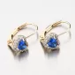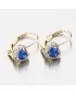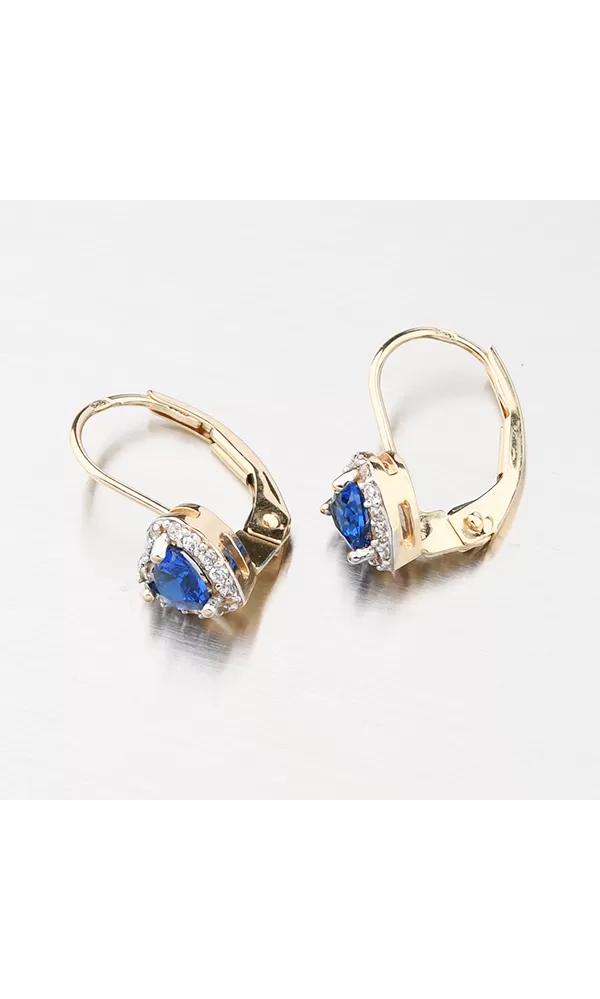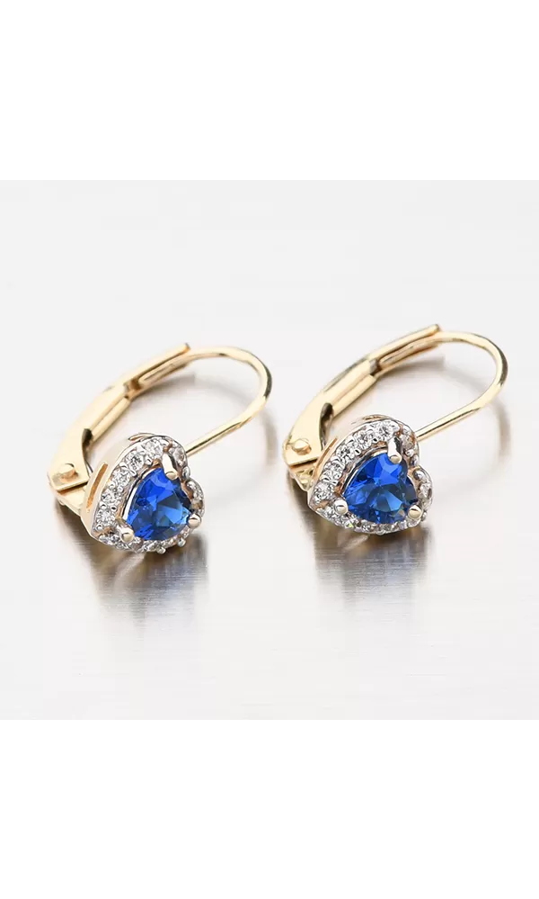 Romantické náušnice pro ženy nebo slečnu s ozdobou ve tvaru srdce. Dominantou náušnice je syntetický safír, který je precizně broušený do tvaru srdce. Kolem syntetického safíru jsou vsazeny zirkony v briliantovém brusu. Všechny kameny jsou důkladně uchyceny a vsazeny do zlata. Náušnice mají pevnou konstrukci a zapínání na klapku. Ozdobte se něžným šperkem, který zdůrazní váš půvab. Náušnice jsou vhodné pro každodenní nošení.