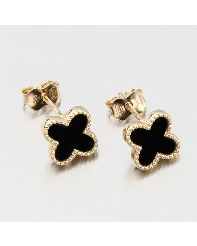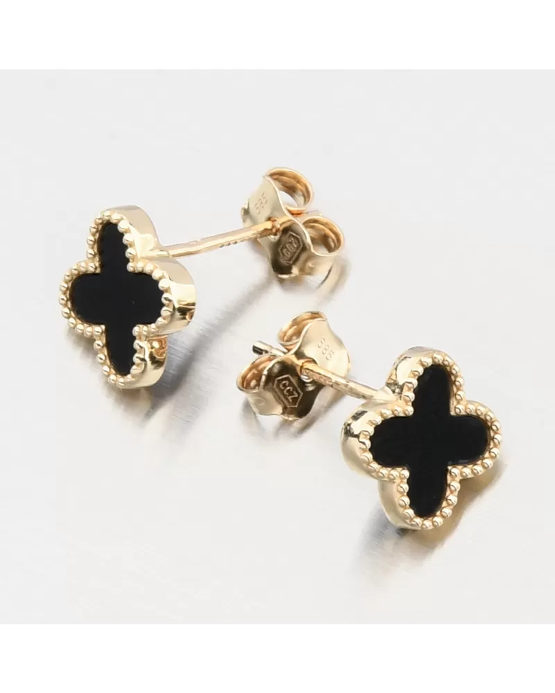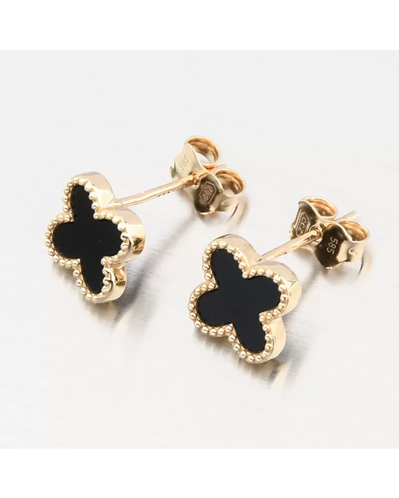 Moderné náušnice v populárnom tvare štvorspelného ďateliny zdobeného čiernym sklovinou. Kombinácia žltého zlata s čiernou farbou je veľmi elegantná. Náušnice sú dokonale spracované do najmenších detailov a budú ideálnym darčekom, ktorý určite poteší dievča alebo ženu.