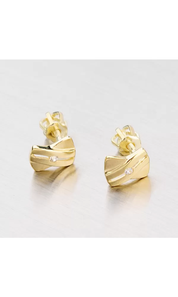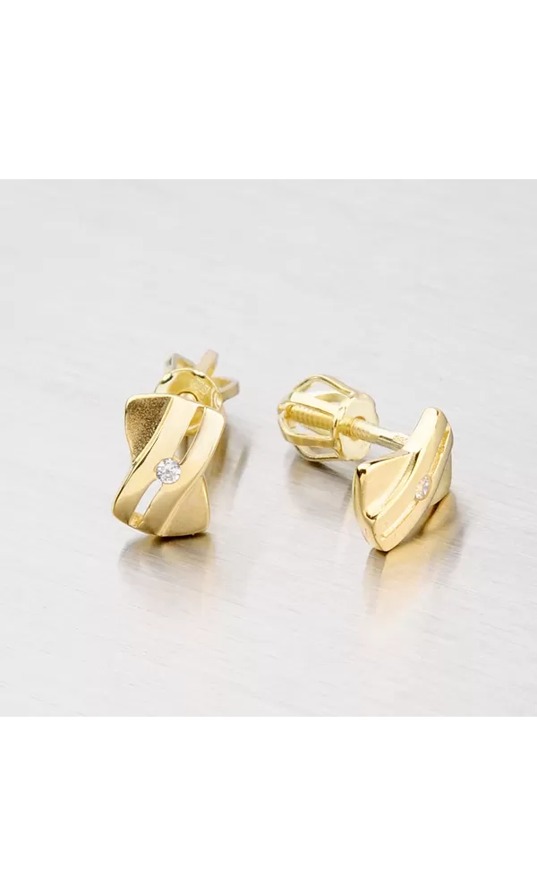 Jemné dámske náušnice s bielym zirkónom vyrobené zo žltého štrnástich karátového zlata 585/1000 v kombinácii lesklej a matnej povrchovej úpravy. Náušnice sa zapínajú na skrutky.