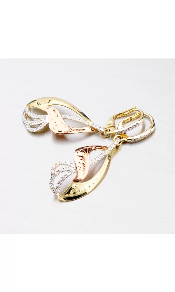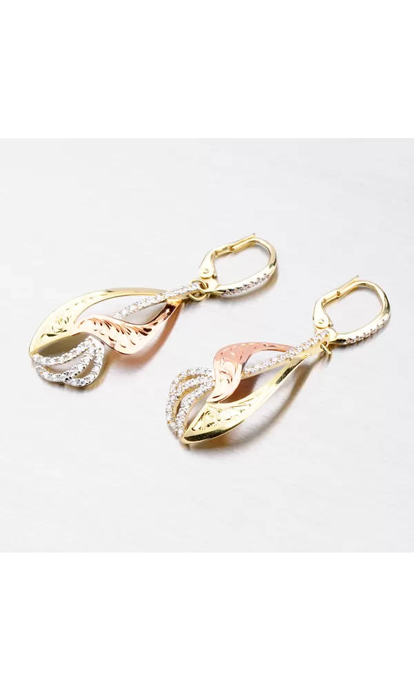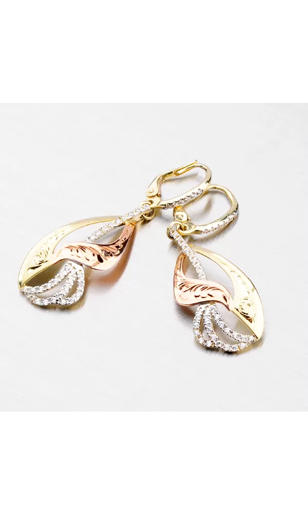 Žiarivé náušnice so zirkónmi Vás okúzlia na prvý pohľad. Náušnice sa Vám budú hodiť ako pre spoločenské udalosti, tak aj pre každodenné nosenie. Dámske náušnice vyrobené zo žltého, červeného a bieleho štrnásťkarátového zlata 585/1000 v kombinovanej povrchovej úprave lesk - mat. Ramienka z bieleho zlata sú vysadené okrúhlymi zirkónmi a výlisky sú zdobené ručnou rytinou. Náušnice majú zapínanie na klapky. Zaujmite týmito neprehliadnuteľnými náušnicami.