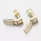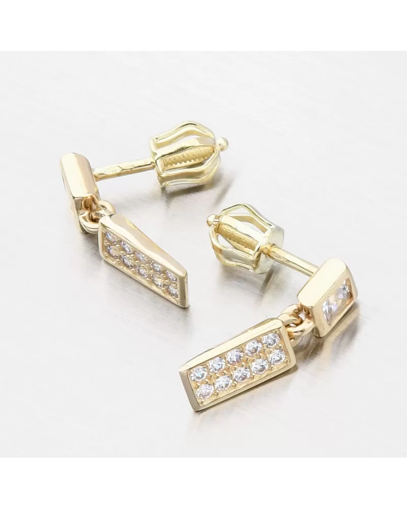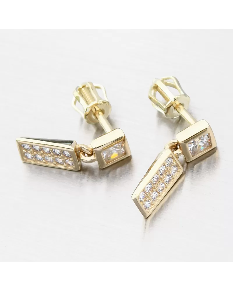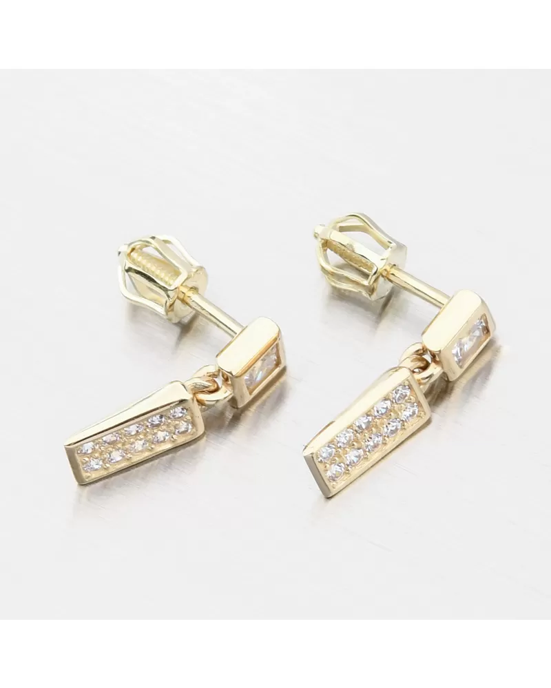 Jemné a žiarivé náušnice zo žltého zlata, ktoré majú zirkón štvorcového tvaru u ktorého visí ozdoba hranatého tvaru osadená nádhernými zirkónmi. Zirkóny na visiacej ozdobe sú briliantového brusu, ktorý zaisťuje maximálnu brilanciu vybrúsených facet, dokonale odráža svetlo a neuveriteľne žiari z každého uhla pohľadu.