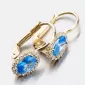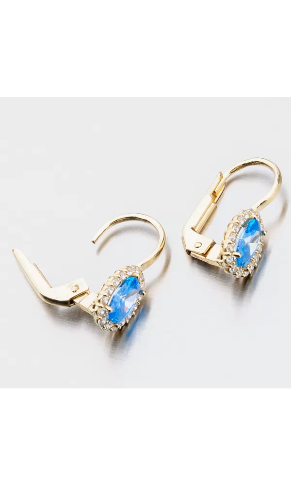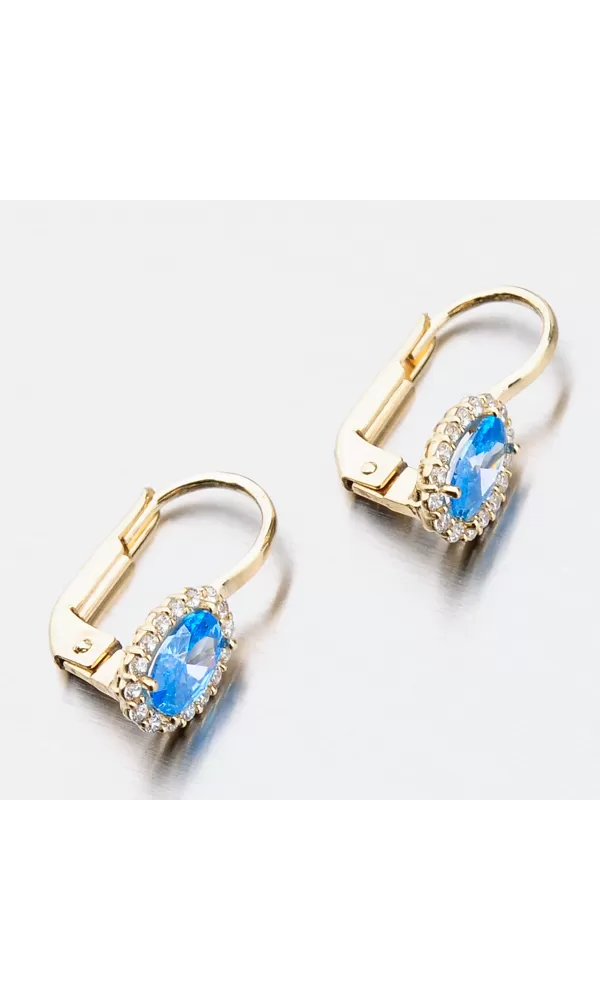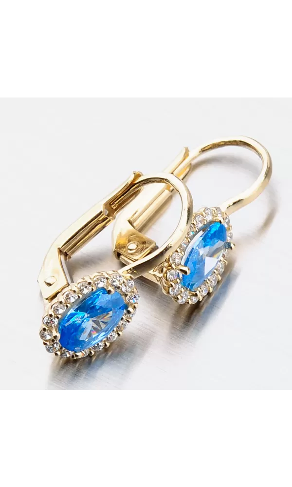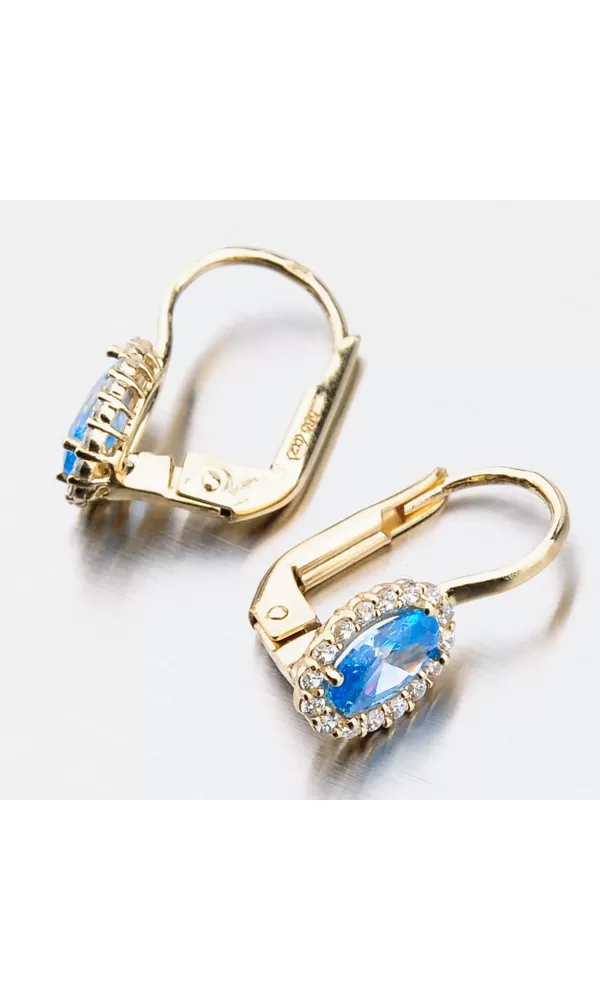 Nechte se okouzlit výjimečným šperkem. Tyto zlaté náušnice zaujmou na první pohled syntetickým akvamarínem, který je broušen do oválného tvaru. Tento modrý kámen pevně svírají čtyři krapny. Okolo syntetického akvamarínu jsou vsazeny zirkony v briliantovém brusu. Toto provedení zlatých náušnic nikdy nevyjde z módy a jejich design je vhodný pro každodenní nošení i do společnosti.