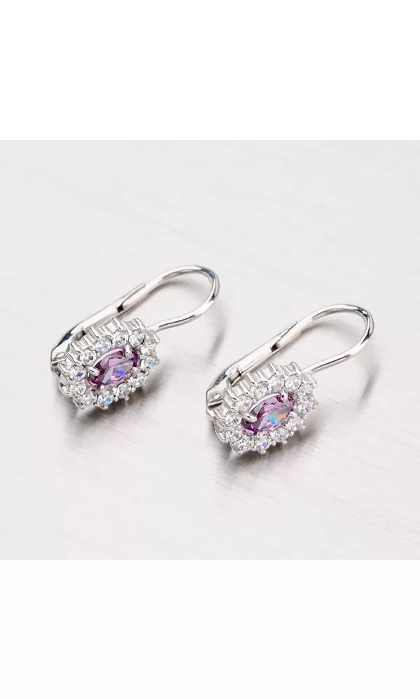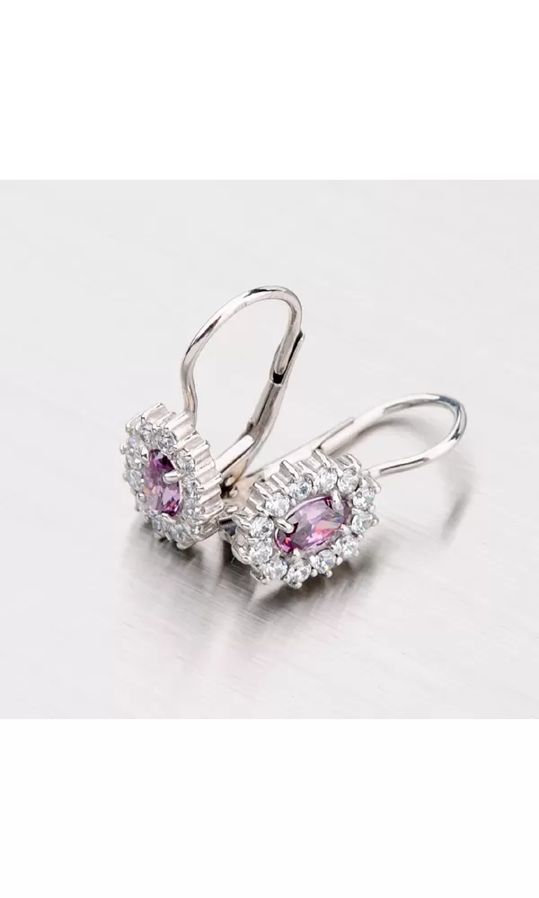 Elegantné náušnice so syntetickým ametystom a so zirkónmi Vás očaria na prvý pohľad. Náušnice sa Vám budú hodiť ako pre spoločenské udalosti, tak aj pre každodenné nosenie. Dámske náušnice sú vyrobené z bieleho štrnásťkarátového zlata 585/1000 v lesklej povrchovej úprave s klasickým zapínaním na klapky.