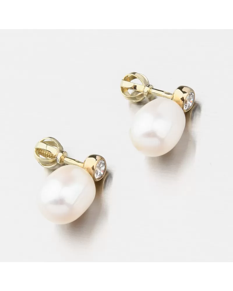 Elegantní náušnice ve formě pecek, které mají v horní části jeden zirkon briliantového brusu. Tento brus zajišťuje maximální brilanci vybroušených facet, dokonale odráží světlo a neuvěřitelně září z každého úhlu pohledu. Pod zirkonem se nachází oválná přírodní sladkovodní perla, která dodá náušnicím ten správný šmrnc.