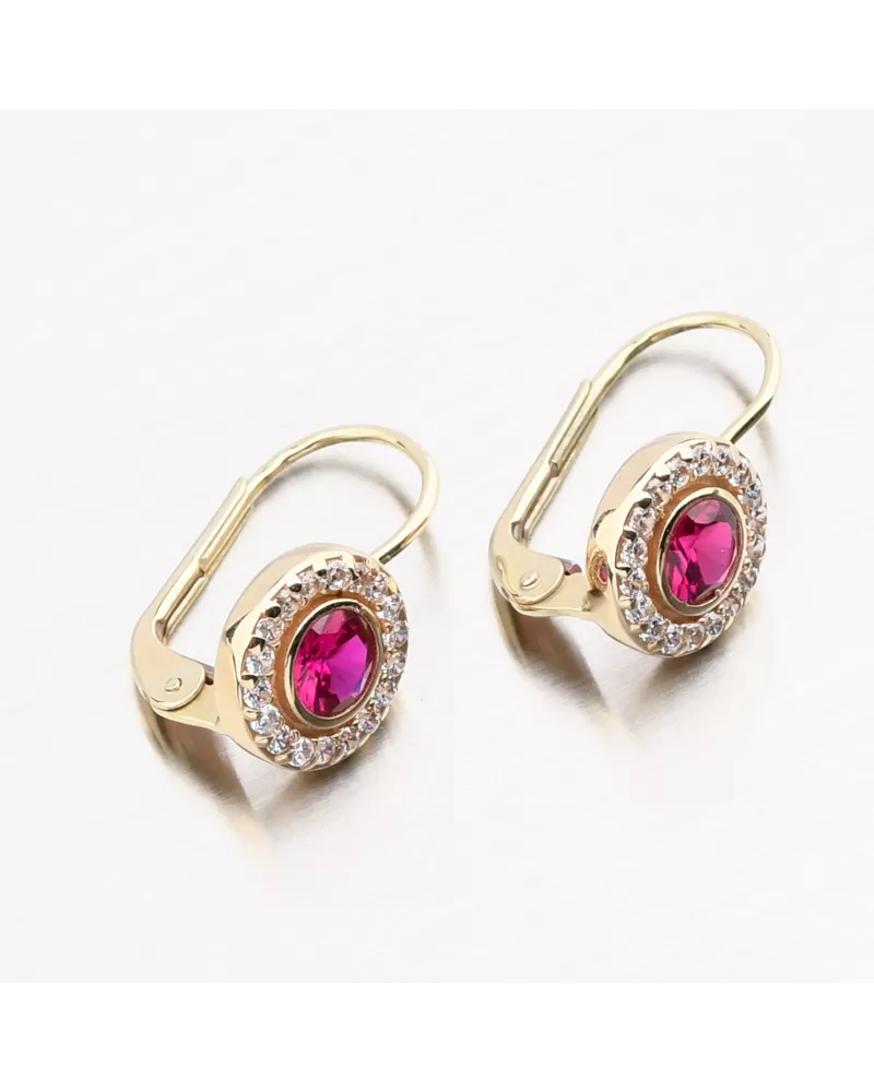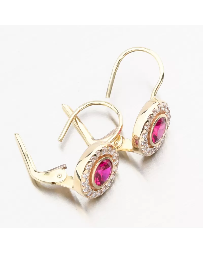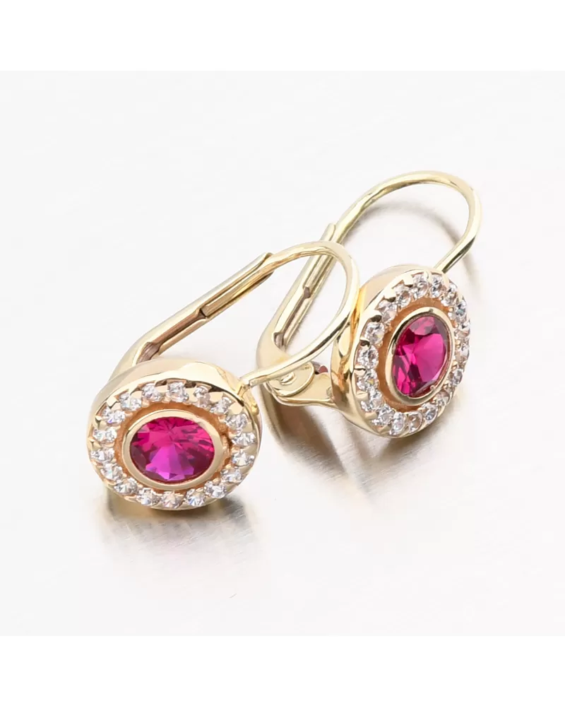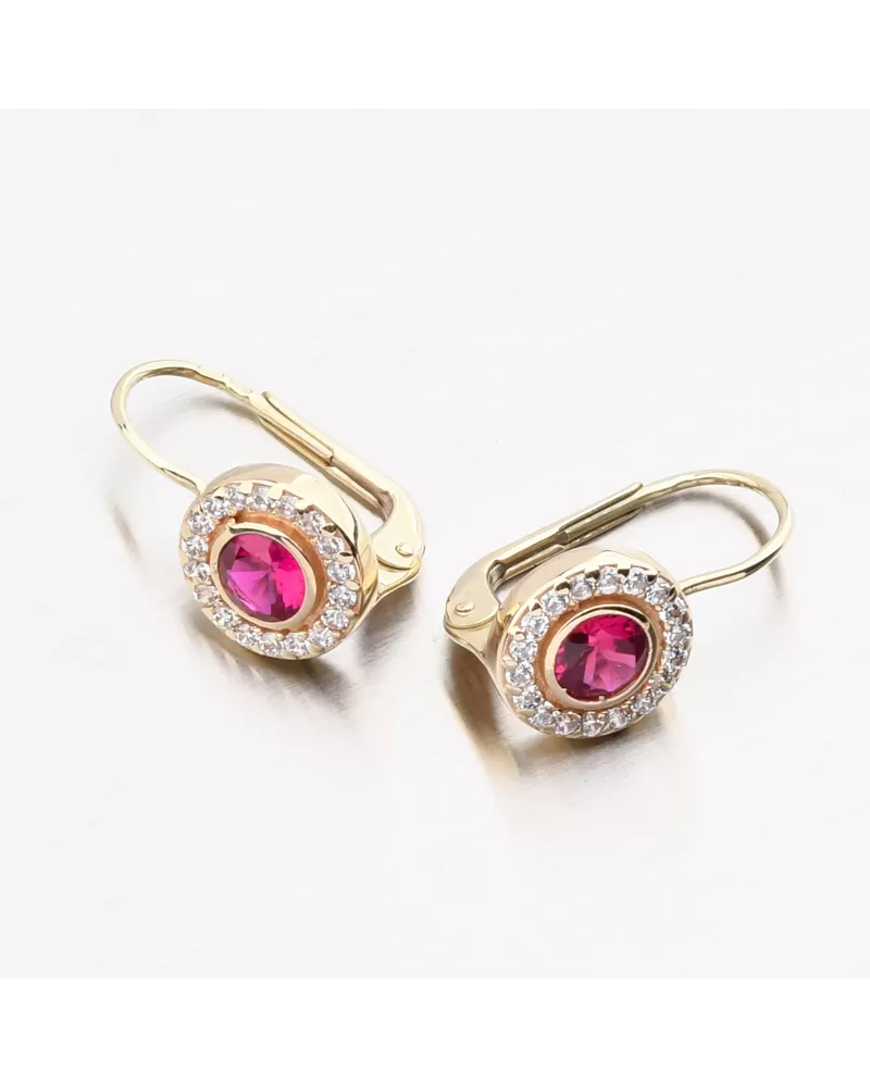 Zlaté náušnice sa môžu pochváliť syntetickým rubínom okrúhleho tvaru v strede samotného ornamentu. Ruby je dominantnou črtou tohto modelu náušníc a je predovšetkým voľbou pre sebavedomé ženy. Okolo Rubín sú nastavené biele zirkóny brilantného strihu, čo dáva kamene brilantnosť skutočných diamantov. Náušnice budú vhodné na spoločenské udalosti alebo na dokonalé ladenie pracovného oblečenia.