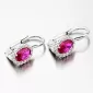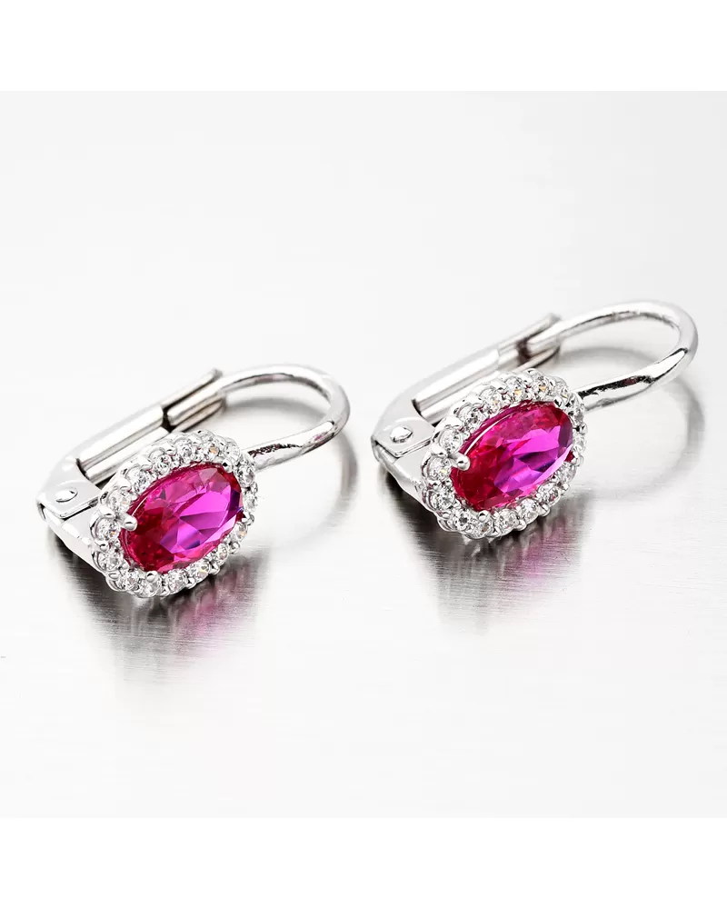 Elegantní model dámských náušnic je zdoben syntetickým rubínem v jeho typické červené barvě. Syntetický rubín je broušen do oválného tvaru a kolem něj jsou precizně vsazeny zirkony v briliantovém brusu. Zirkony dokonale zvýrazňují červený syntetický rubín a díky briliantovém brusu září jako pravé diamanty. Náušnice se zapínají na klapku.