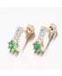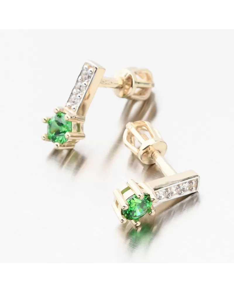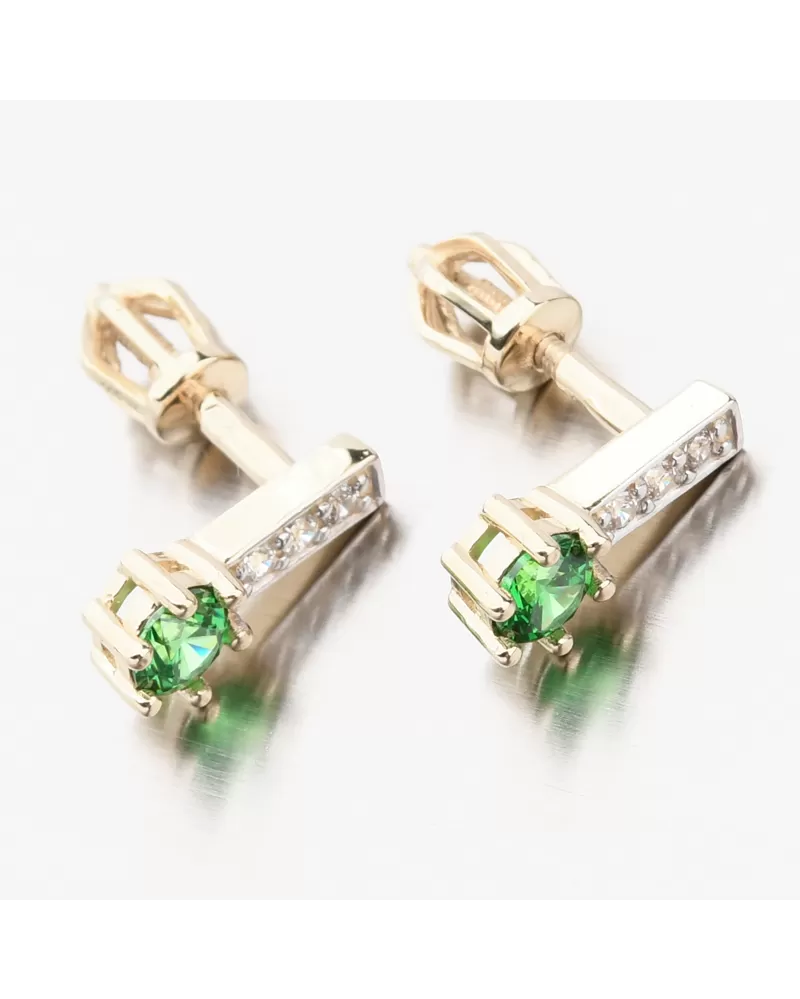 Elegantní zlaté náušnice, které mají v horní části čiré zirkony, které jsou pod sebou - tato část je v bílé barvě zlata. Pod zirkony je umístěn výrazný syntetický smaragd, který je upevněn pomocí šesti krapen. Smaragd je dominantou tohoto modelu náušnic a dokonale zvýrazní přednosti obličeje a doplní celkový vzhled. Zirkony a smaragd jsou broušeny do briliantového brusu, který propůjčuje kamenům brilanci pravých diamantů.
