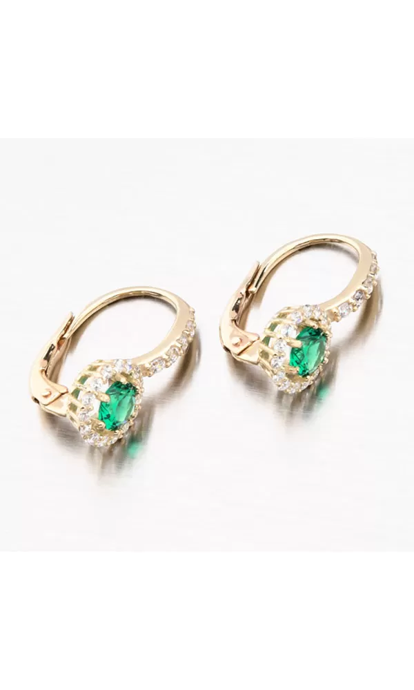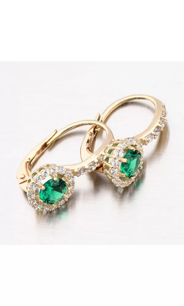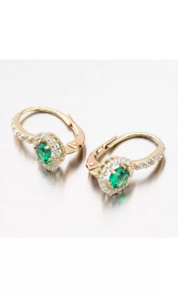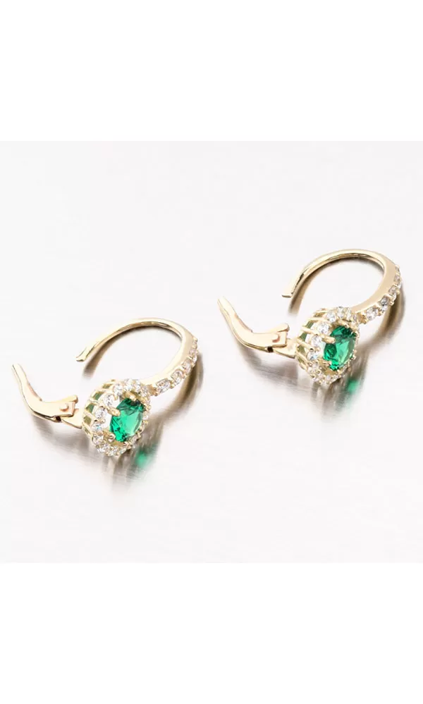 Zlaté klasické náušnice se můžou pyšnit syntetickým smaragdem v briliantovém brusu, který je dominantou tohoto modelu. Kolem syntetického smaragdu jsou vsazeny zirkony v briliantovém brusu. Tento brus propůjčuje kamenům brilanci pravých diamantů. Náušnice se zapínají na klapku.