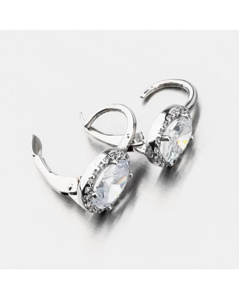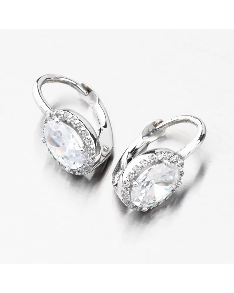 Zářivé náušnice z bílého zlata, které nesmí chybět ve vaší šperkovnici. Elegance, třpyt a luxus. To jsou tyto božské náušnice. Výrazný oválný zirkon je ve středu náušnice a kolem něj po celém obvodu jsou drobné další zirkony. Drobné zirkony jsou briliantového brusu, který propůjčuje kamenům brilanci pravých diamantů. Náušnice budou vhodné na společenské události, ale také na každodenní nošení. Náušnice jsou menší velikosti, a proto budou vhodné i pro slečny a dívky od 3 let.