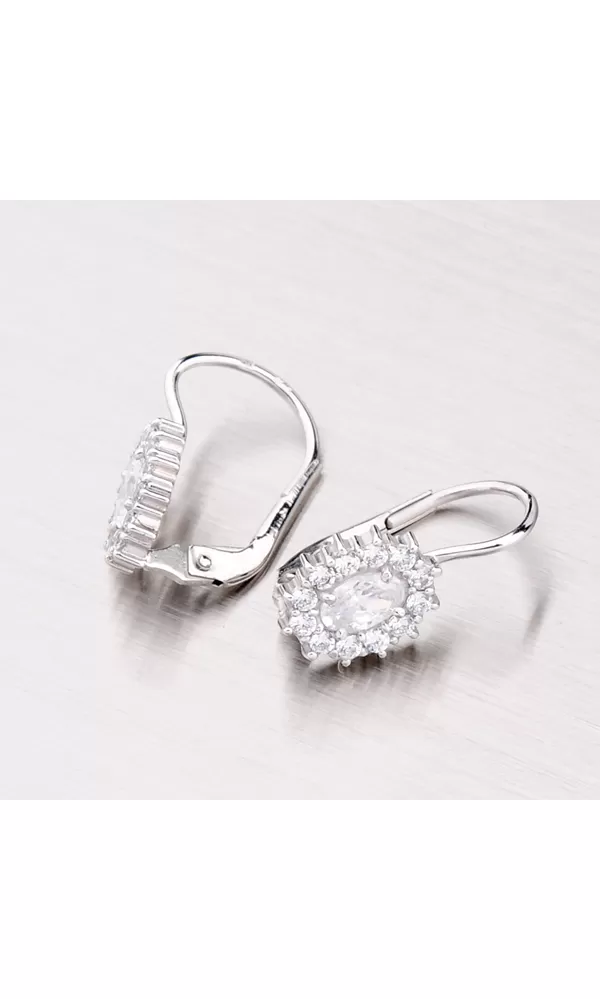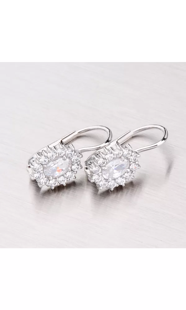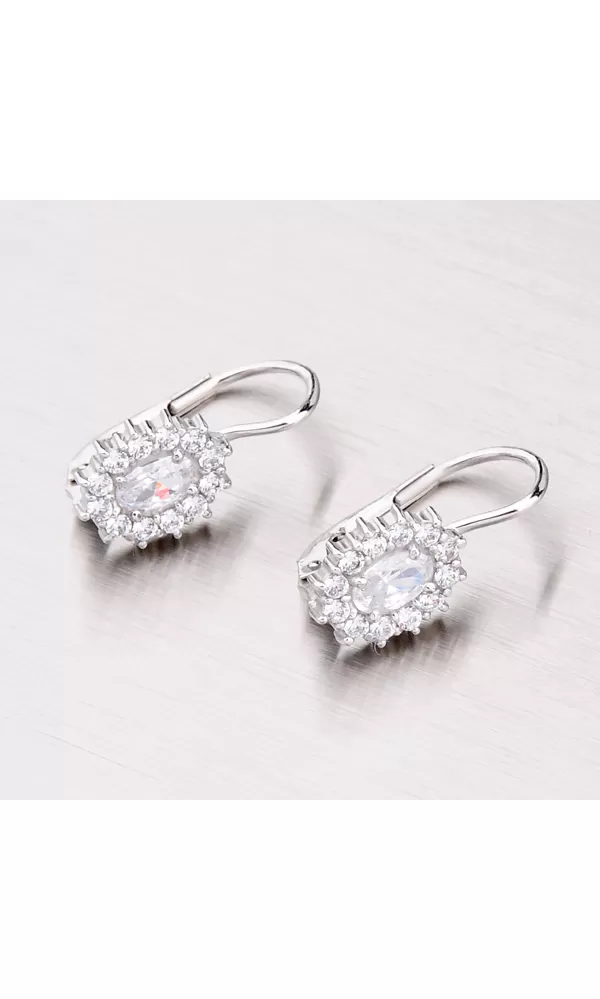 Dámske náušnice s oválnym bielym zirkónom, ktorý je dookola vysadený drobnými bielymi zirkónmi sú vyrobené z bieleho štrnásťkarátového zlata 585/1000 v lesklej povrchovej úprave. Náušnice sa zapínajú na klapku.