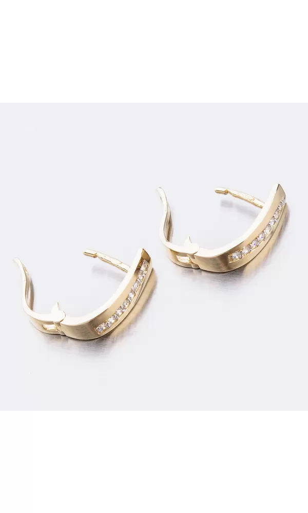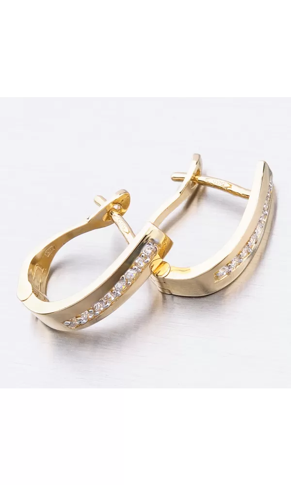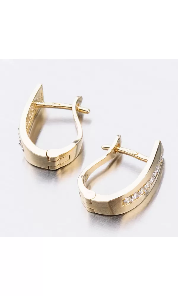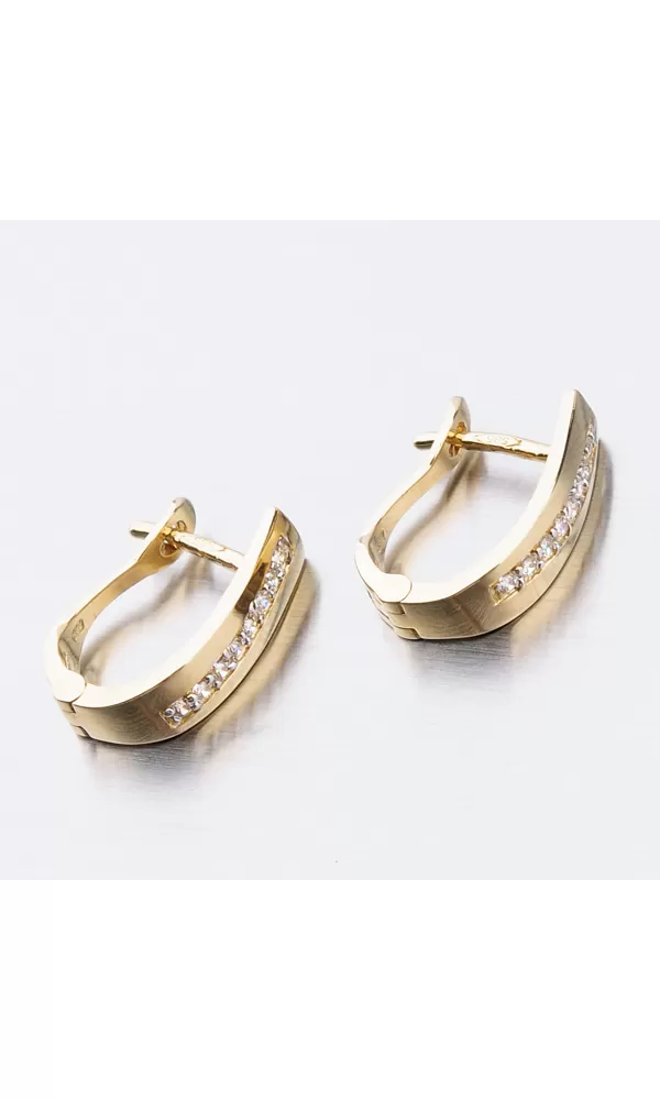 Elegantní visací náušnice jsou v oválném tvaru s rozšířenou přední stranou, která je leštěná do vysokého lesku. Tímto leštěním dokonale vynikne barva zlata, kterou tak milujete. Náušnice zdobí zirkony v briliantovém brusu, které jsou precizně vsazeny v řadě lehce v šikmé linii. Zirkony jsou pevně uchyceny krapnami. Takže nehrozí vypadnutí kamínku. Tento tvaru dokonale padne na ucho a bude slušet každé ženě. Zlaté náušnice se zapínají na pasivní patent.
