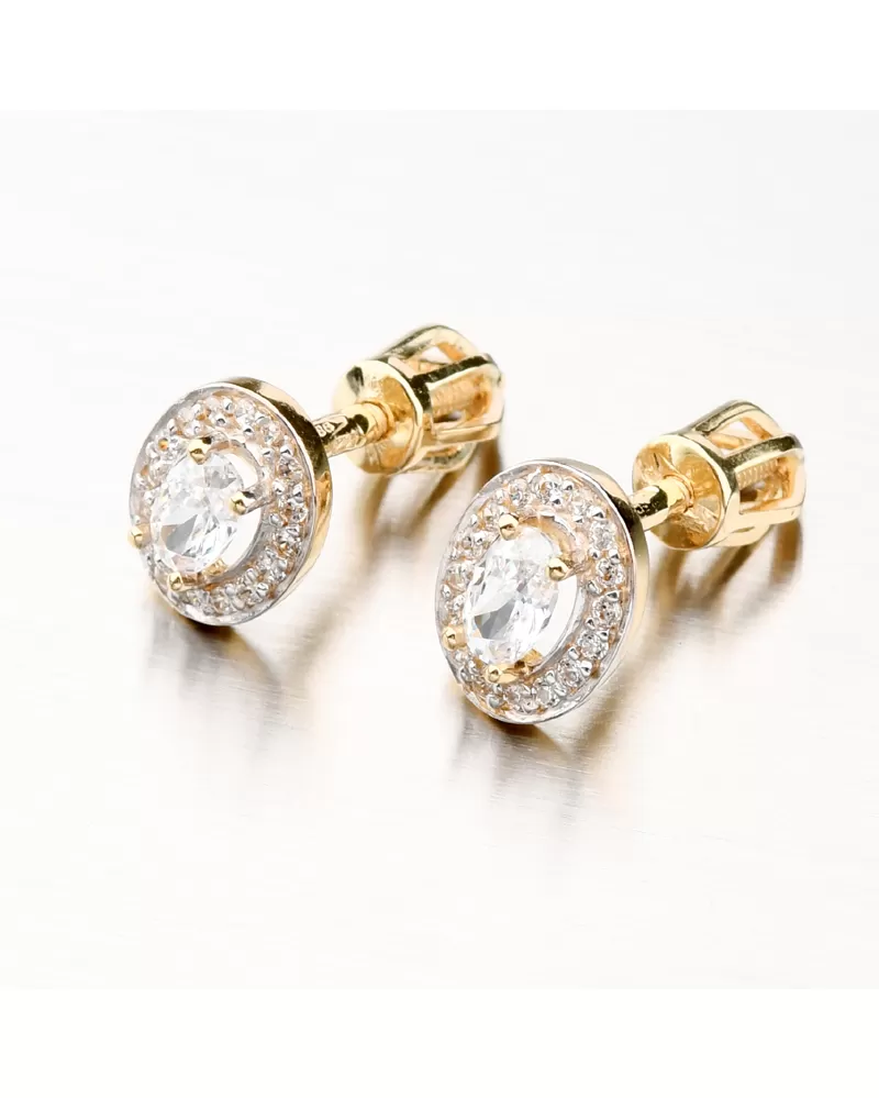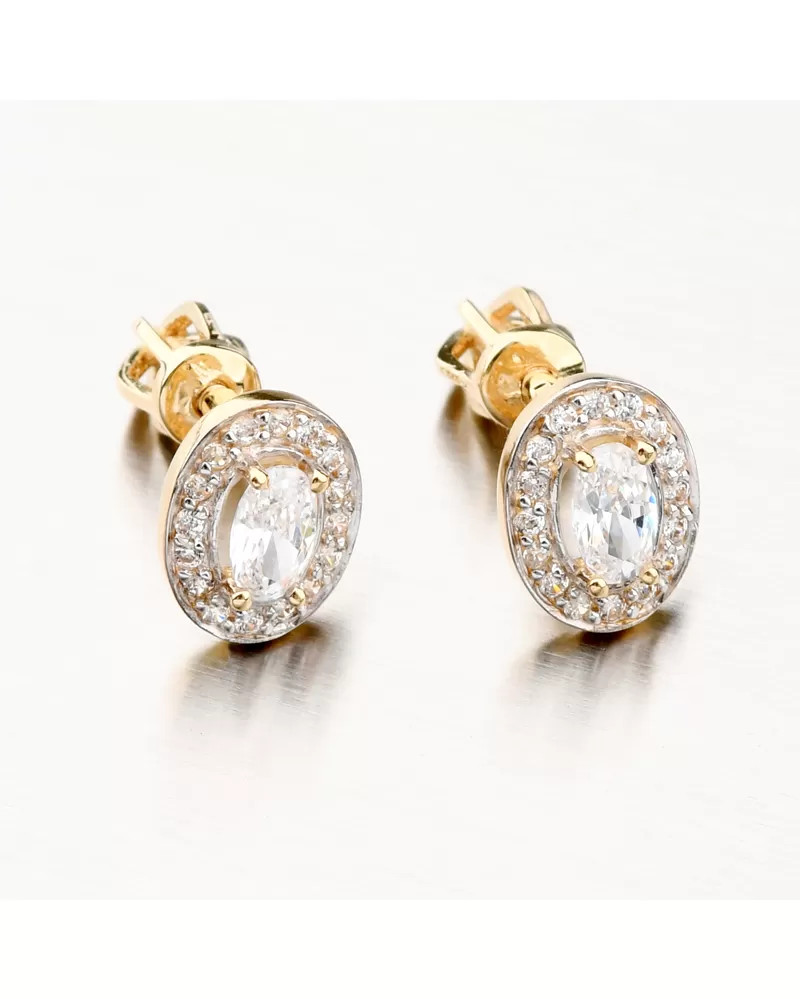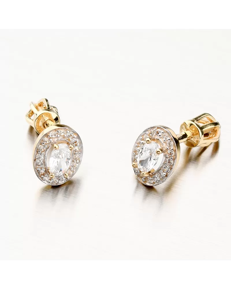 Jednoduché, ale přesto zářivé a výrazné zlaté náušnice. Náušnice zdobí oválný zirkon, který je usazen pomocí čtyř krapen. Poté kolem celého obvodu jsou osazeny bílé kulaté zirkony. Zirkony jsou briliantového brusu, který zajišťuje maximální brilanci vybroušených facet, dokonale odráží světlo a neuvěřitelně září z každého úhlu pohledu.