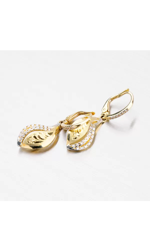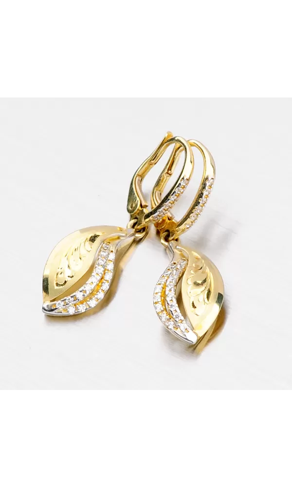Žiarivé náušnice so zirkónmi Vás okúzlia na prvý pohľad. Náušnice sa Vám budú hodiť ako pre spoločenské udalosti, tak aj pre každodenné nosenie. Dámske náušnice vyrobené zo žltého a bieleho štrnásťkarátového zlata 585/1000 v kombinovanej povrchovej úprave lesk - mat. Krajné ramienka z bieleho zlata sú vysadené okrúhlymi zirkónmi a výlisok je zdobený ručným rytím. Náušnice majú zapínanie na klapky. Zaujmite týmito neprehliadnuteľnými náušnicami.