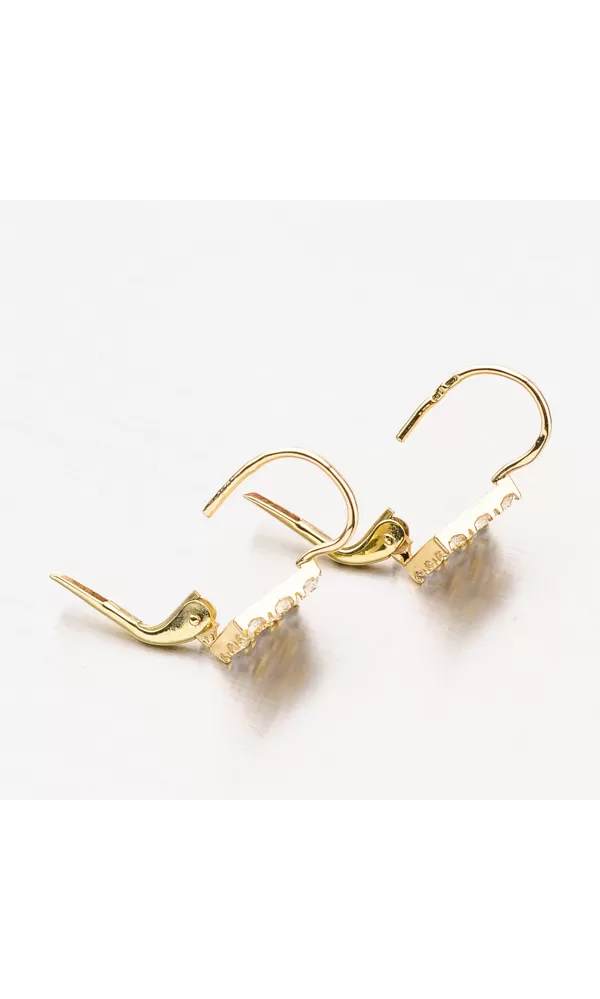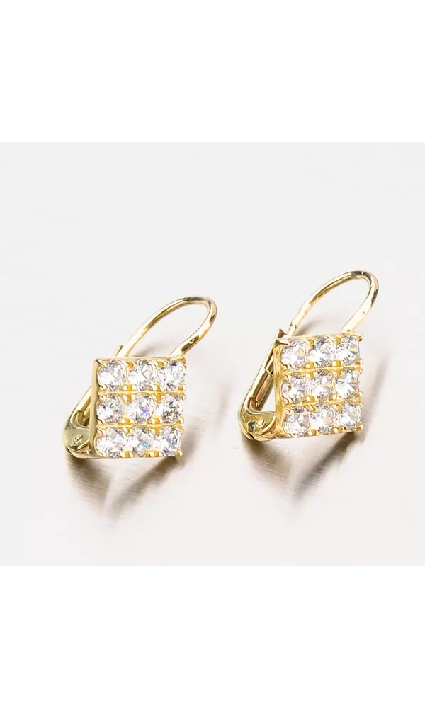 Elegantné visiace náušnice sú vyrobené zo žltého štrnásťkarátového zlata 585/1000 v lesklej povrchovej úprave. Náušnice zdobia deväť žiarivých zirkónov v briliantovom bruse vsadené do štvorca. Zirkóny dokonalé odrážajú svetlo a náušnice sú vďaka nim neprehliadnuteľné. Náušnice majú tradičné zapínanie na klapku, ktoré je veľmi pohodlné a bezpečné.