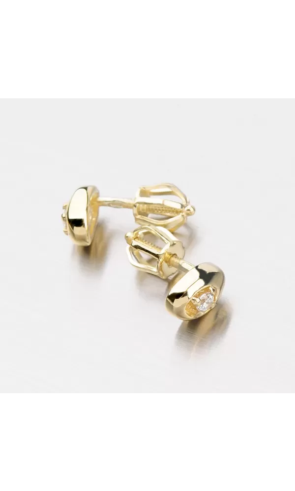 Elegantné jednoduché náušnice vyrobené zo žltého zlata s rýdzosťou 585/1000 s lesklou povrchovou úpravou sú osadené žiarivými bielymi zirkónmi. Náušnice sa zapínajú na bezpečný závit, vďaka ktorému nehrozí vypadnutie náušníc z ucha a ich následná strata.