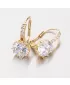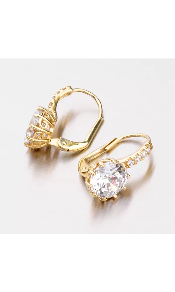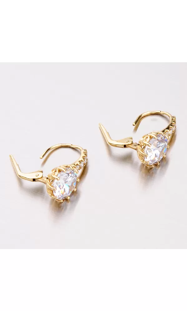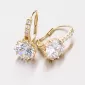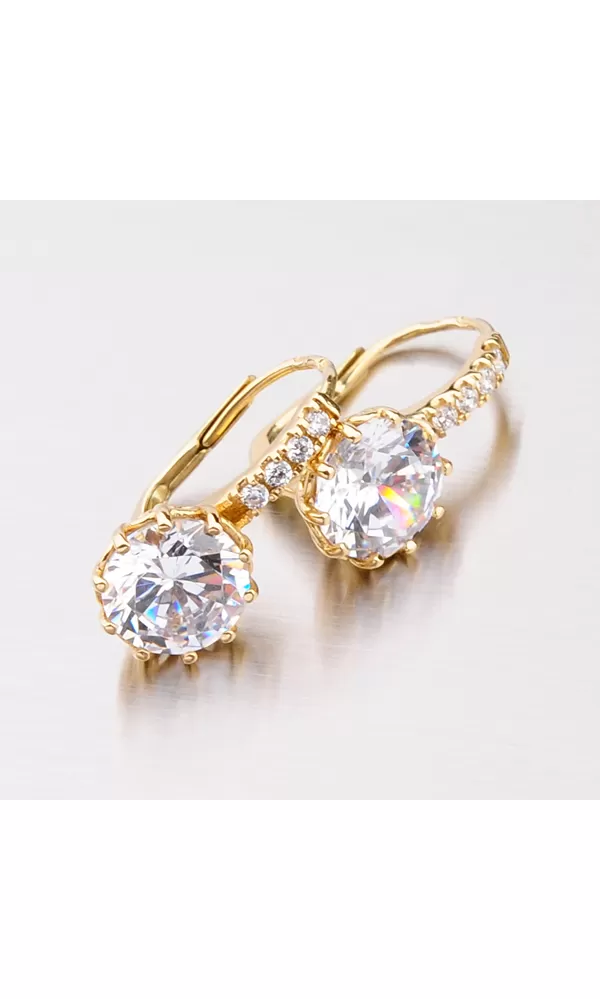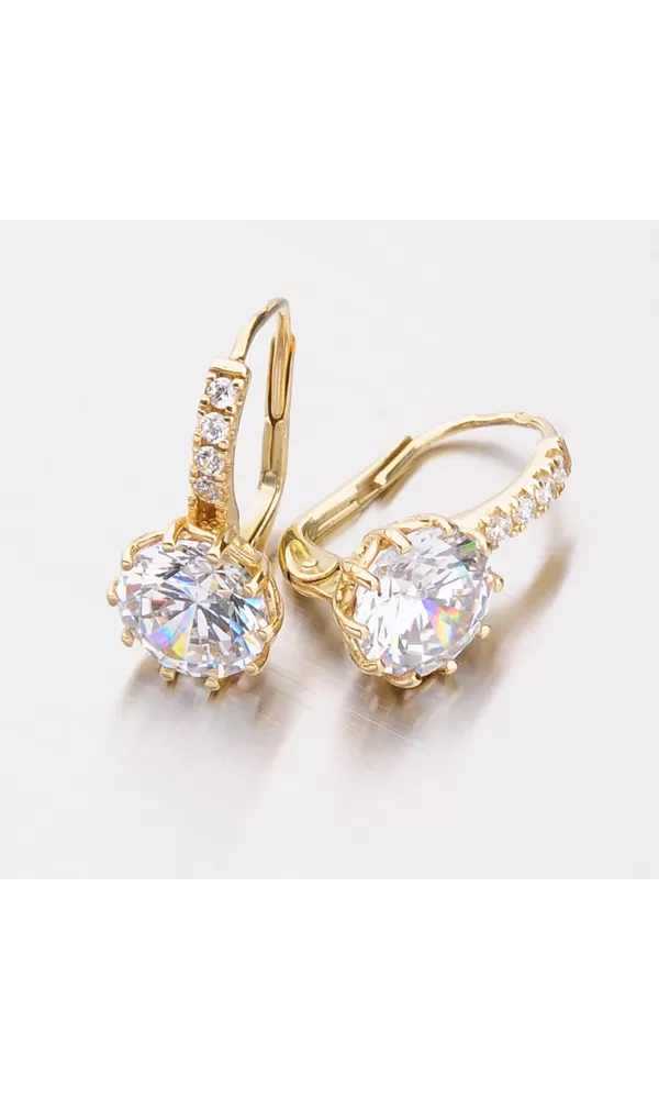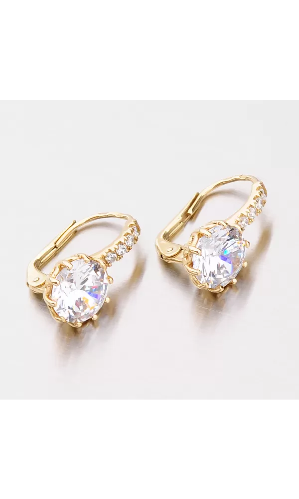 Luxusné dámske náušnice so zirkónmi sú vyrobené zo žltého štrnásťkarátového zlata s rýdzosťou 585/1000 v lesklej povrchovej úprave. Biely zirkón v briliantovom bruse je vsadený do desať-krabovej korunky a nádherne prežiari celý váš vzhľad. Korunka zirkónu je navyše krásne zdobená a tak náušnice upútajú pozornosť aj z boku. Nad veľkým zirkónom sú navyše vsadené do radu ďalšie štyri zirkóny. Náušnice majú klasické zapínanie na klapku. Tieto náušnice patria k obľúbeným typom, ktorým zaručene potešíte každú ženu či dievča. Náušnice vyzerajú luxusne a budú sa hodiť na každú príležitosť.