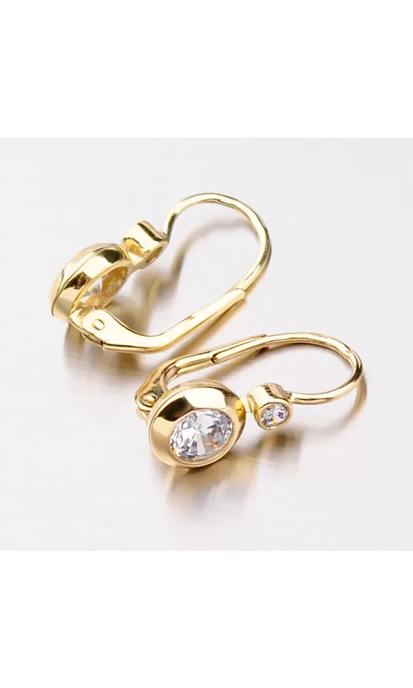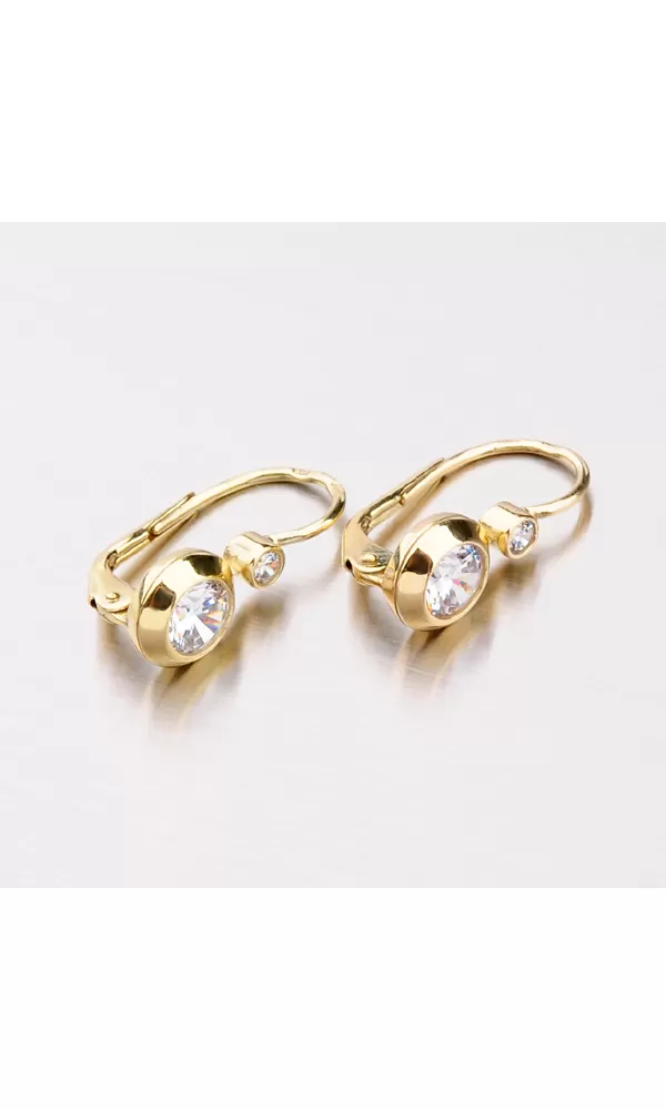 Elegantné dámske náušnice so zirkónmi sú vyrobené zo žltého štrnásťkarátového zlata s rýdzosťou 585/1000 v lesklej povrchovej úprave. Dva biele… Celý popis