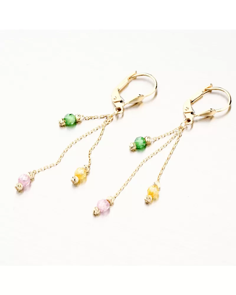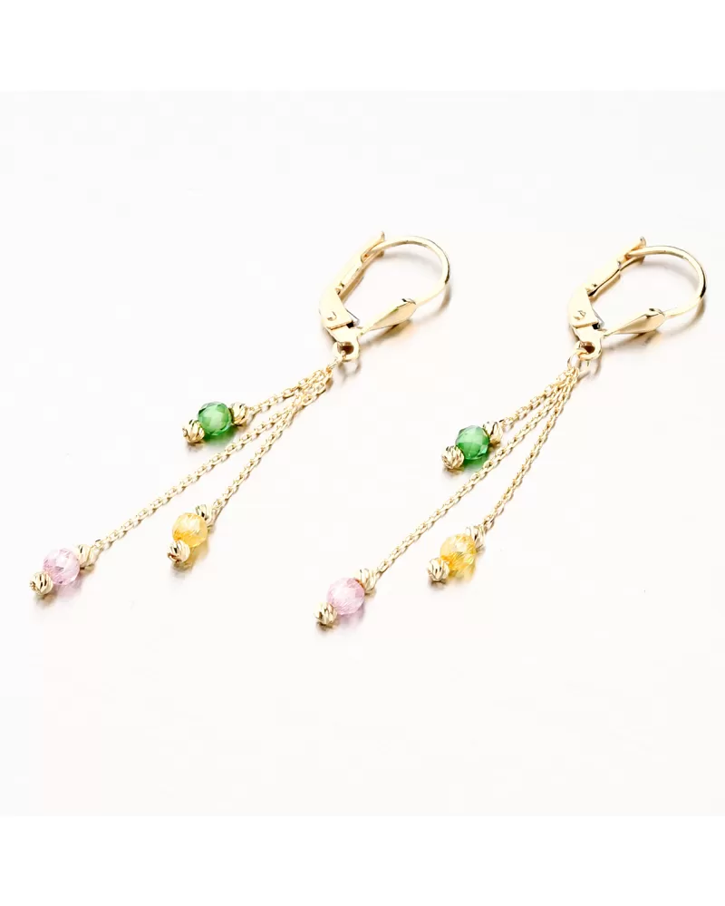 Ozdobte se těmito originálními náušnicemi. Tento model se skládá z klasické konstrukce, která je zdobena třemi řetízky různých délek a ty jsou ukončeny zlatými kuličkami a mezi nimi jsou barevné broušené zirkony a to v barvě růžové, zelené a žluté. Zlaté kuličky jsou zvýrazněné facetami. Facety jsou zhotoveny diamantovým nástrojem, který dodává vzniklým facetám maximální lesk, díky kterému dokonale odráží světlo a mají krásnou brilanci ze všech úhlů pohledu!
