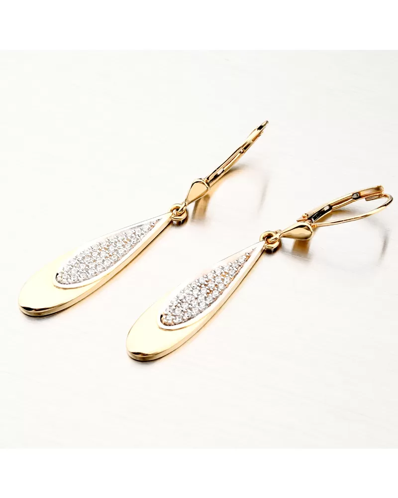 Nádherné visiace zlaté náušnice, ktoré zaujmú precíznym prevedením a kvalitným spracovaním. Náušnice majú visiacu ozdobu v tvare kvapky, kde spodná časť je vy vysokom lesku a potom je menšia slza osadená žiarivými zirkónmi. Zirkóny sú briliantového brusu, ktorý prepožičiava zirkónom brilanciu pravých diamantov, ktorý podporí aj konštrukcia náušníc. Konštrukcia je navrhnutá tak, aby dokonale prestupovalo svetlo okolo zirkónov.