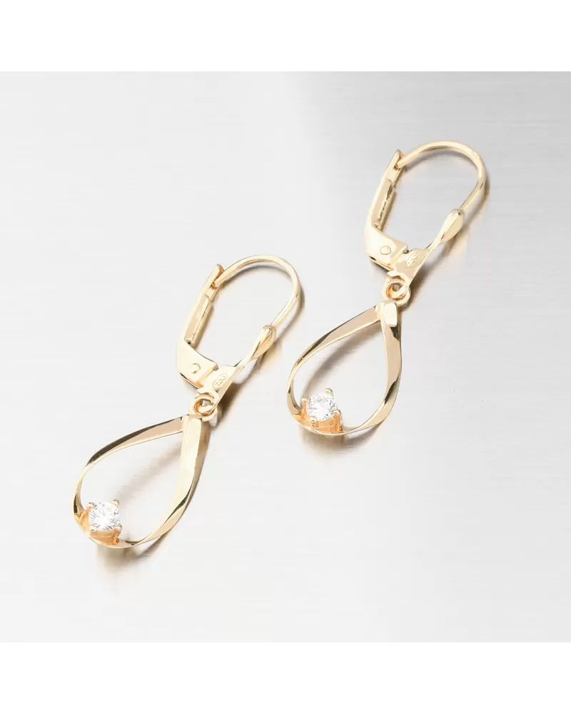 Elegantné zlaté visiace náušnice sa stanú výrazným doplnkom, ktorý vás zviditeľní, zvýrazní a opticky zúži tvár. Visiaca ozdoba náušníc v tvare slzy, ktorá je pohyblivá, je v dolnej časti ozdobená zirkónom. Zirkón je briliantového brusu, ktorý zaisťuje maximálnu brilanciu vybrúsených facet, dokonale odráža svetlo a neuveriteľne žiari z každého uhla pohľadu. Náušnice budú vhodné na všetky príležitosti, kde bude vašim prianím zažiariť.