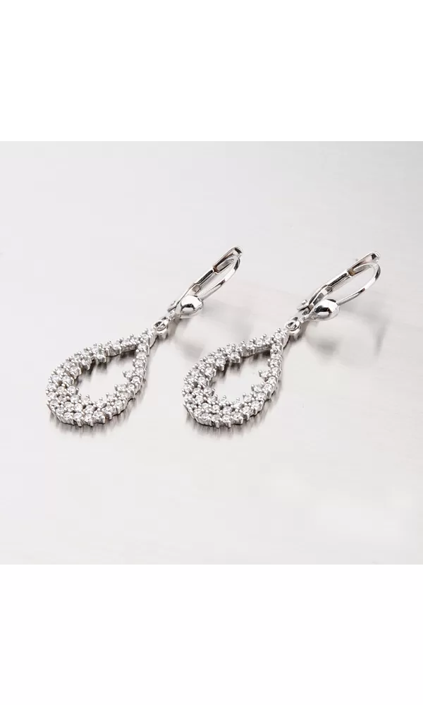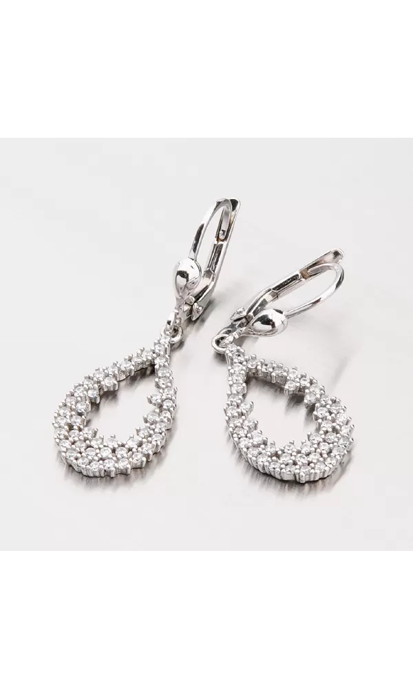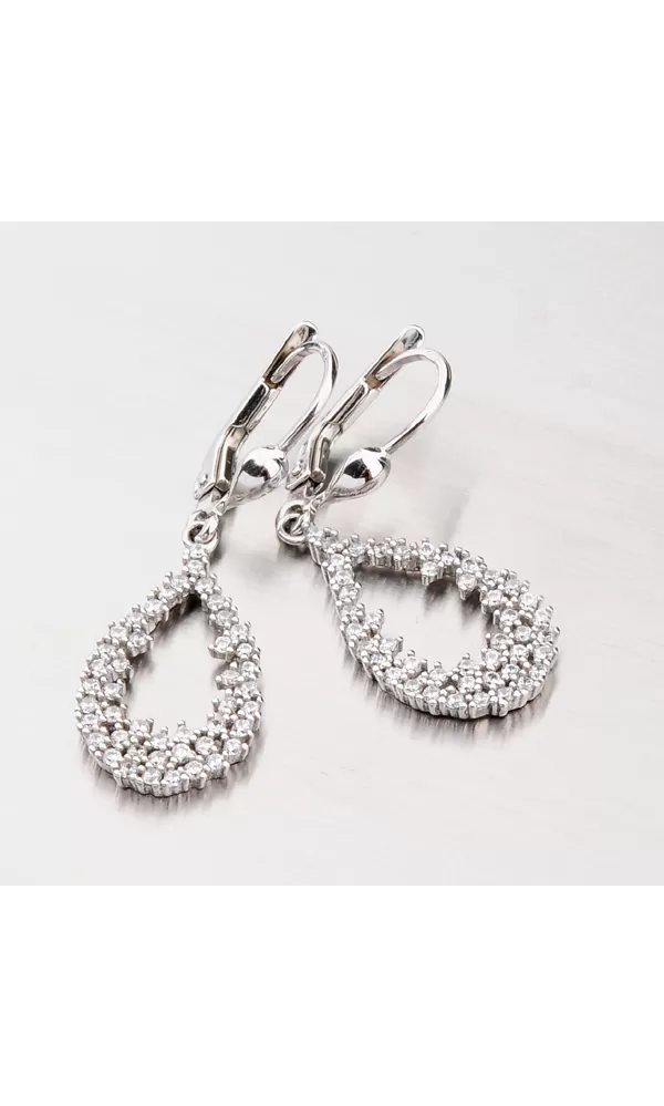 Visiace dámske náušnice vyrobené z bieleho štrnástich karátového zlata o rýdzosti 585/1000 zaujmú svojim osadením žiarivými zirkónmi. Zirkóny je osadená celá visiaca časť náušníc, ktorá je vyrobená do tvaru kvapky. Náušnice zažiaria na každej akcii a pristanú každej žene.