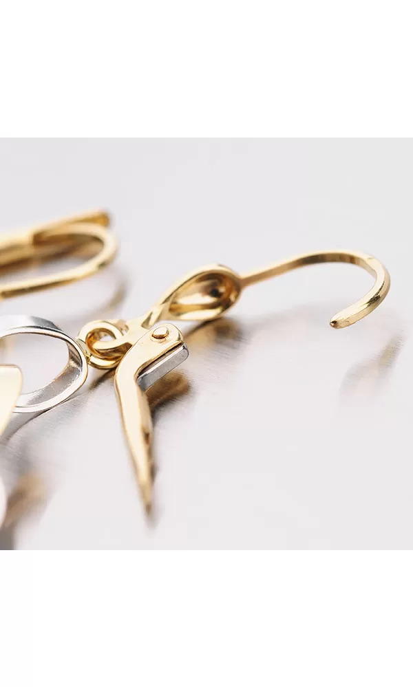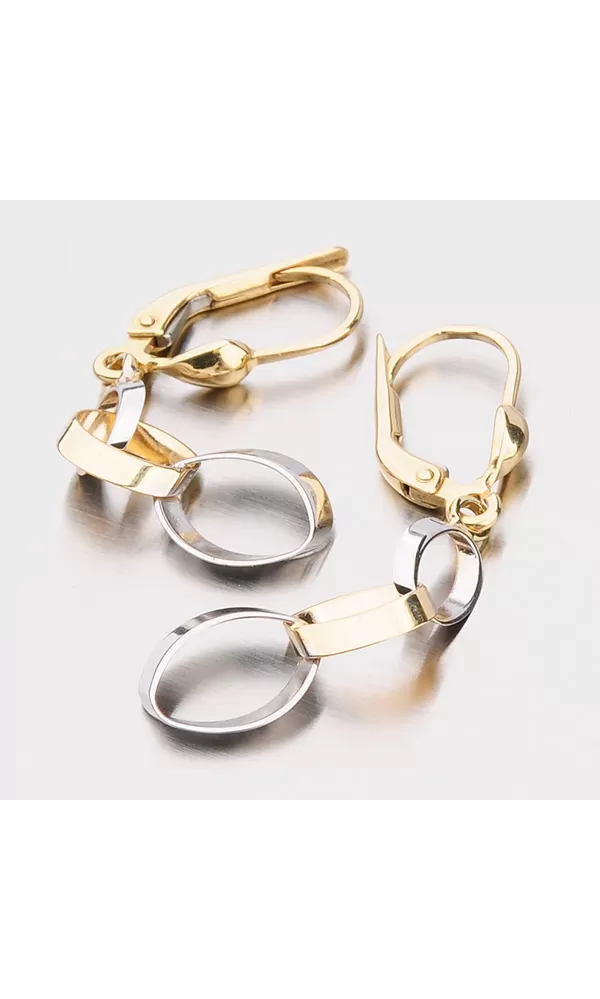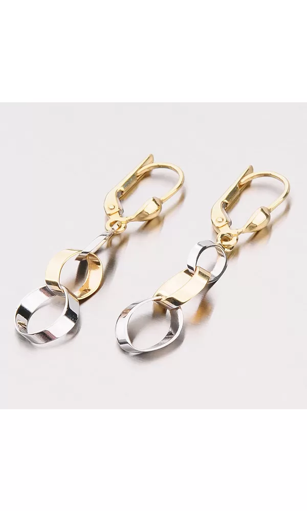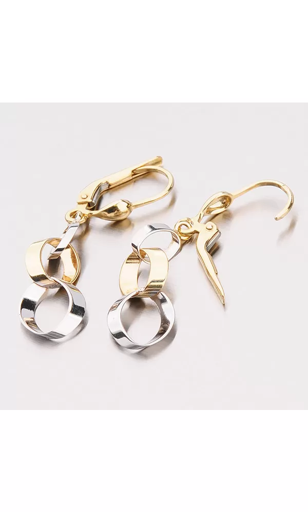 Dvojfarebné visiace náušnice vyrobené zo zlata s rýdzosťou 585/1000 sú zložené z na seba nadväzujúcich krúžkov s lesklým povrchom. Krúžky sa striedajú v bielej a žltej farbe a pôsobia elegantným dojmom. Náušnice zaujmú na každej akcii.