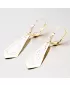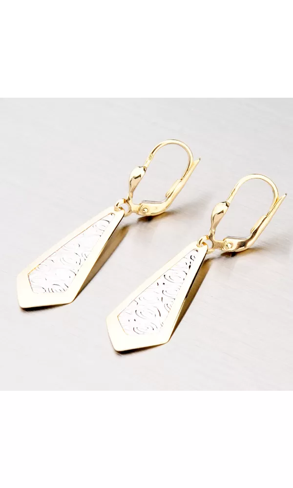 Úchvatné dámske visiace náušnice sú vyrobené v kombinácii žltého a bieleho štrnásťkarátového zlata 585/1000 v lesklej povrchovej úprave so zapínaním na klapky. Biela časť náušníc je zdobená jemným gravírovaním, ktoré zaisťuje vysoký lesk.