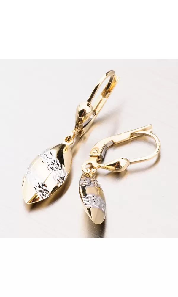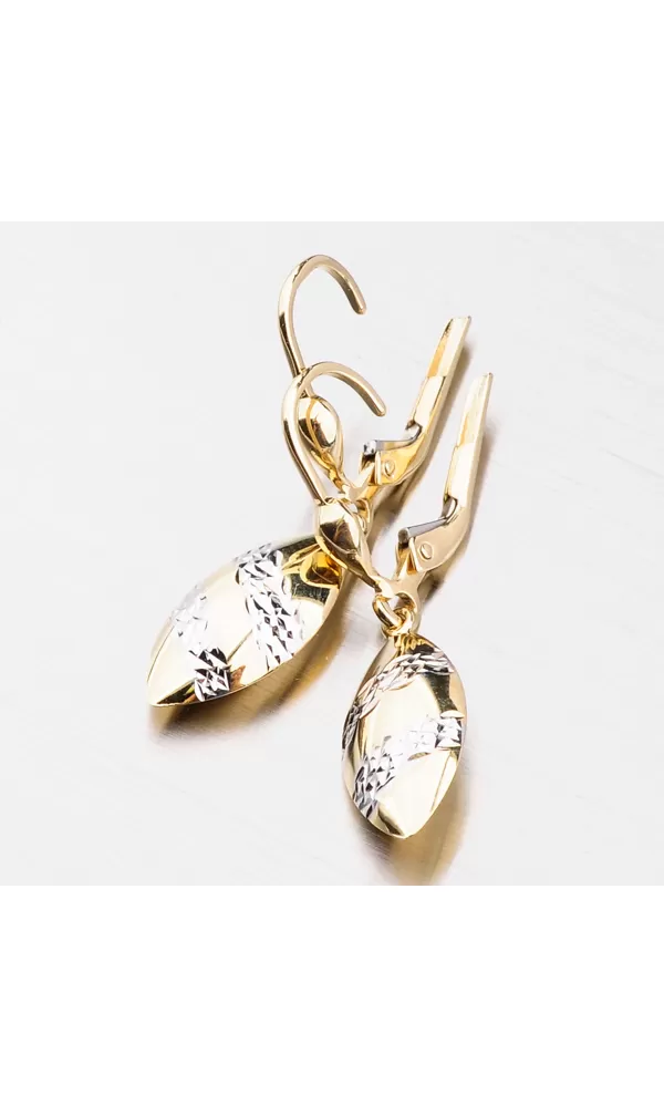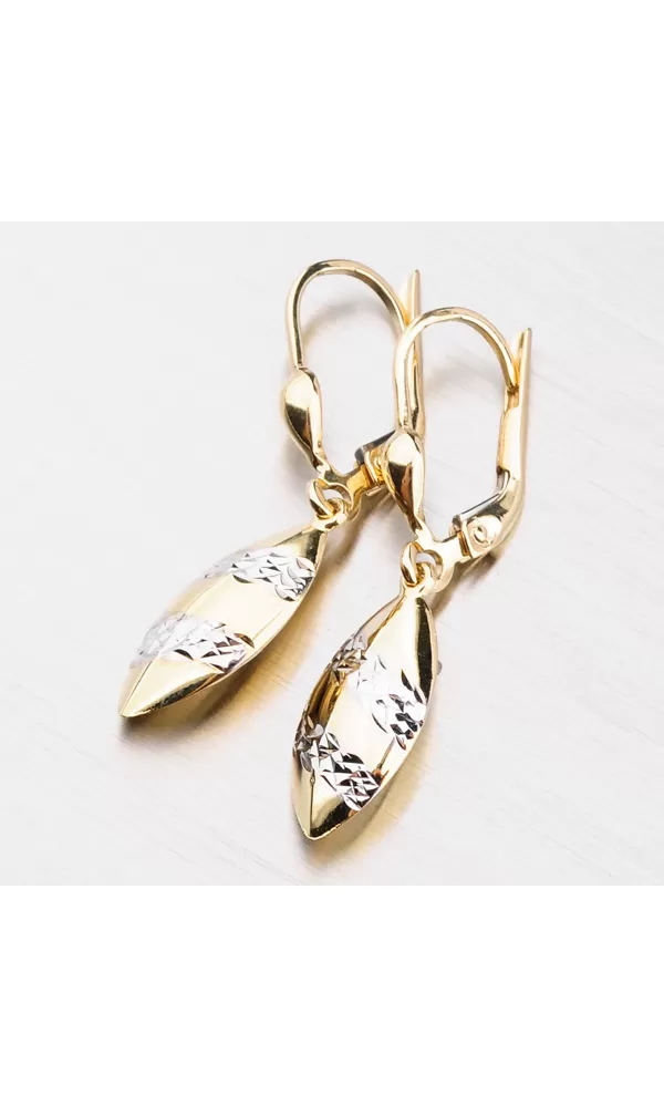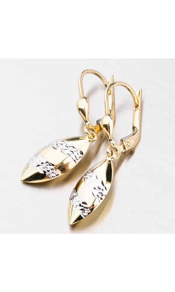 Tyto náušnice si získají vaše sympatie. Visací náušnice tvoří dutý přívěsek v lesklé povrchové úpravě, který svým vzhledem připomíná kapku. Zlaté náušnice jsou dekorovány výrazným gravírováním, který má podklad v barvě bílého zlata.
