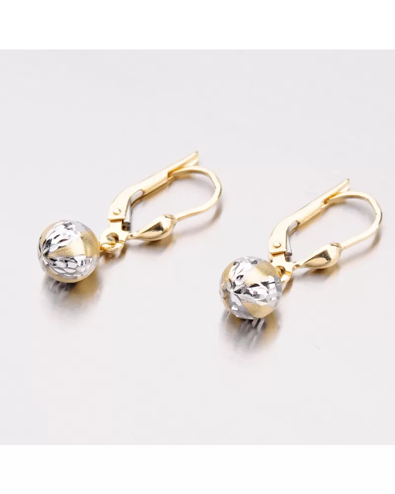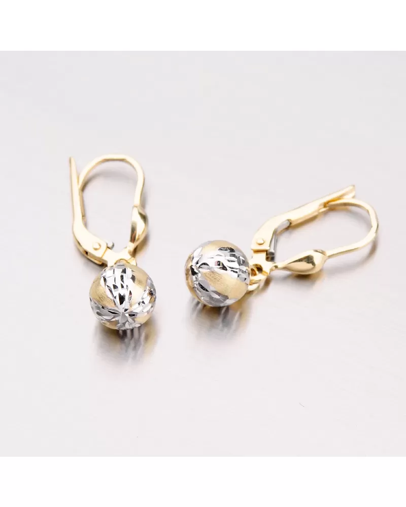 Krásne dámske náušnice rozjasnú oči mnohých z vás. Náušnice sú zdobené príveskom s loptou, ktorý je zdobený farbou bieleho zlata. Časti bieleho zlata sú zvýraznené gravírovaním.  Gravírovanie sa uskutočňuje pomocou hrotu diamantových rýb, ktorý zaisťuje najvyšší možný lesk rytého fazety. Lopta je tiež vyzdobená matným povrchom a vďaka tejto príprave gravírovania je dokonale vyniká.