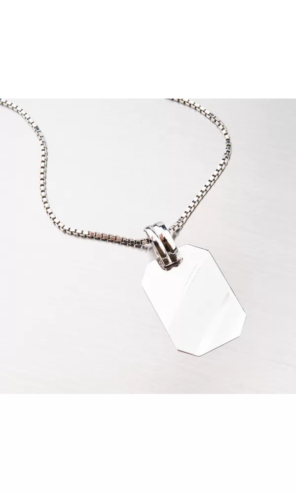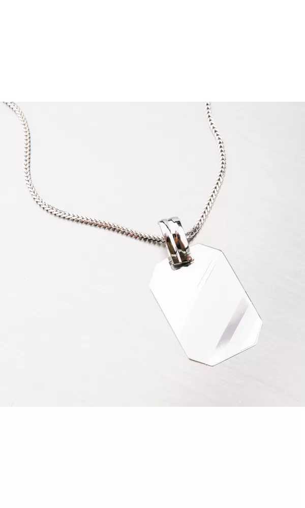 Moderný prívesok v tvare doštičky je vyrobený z bieleho štrnásťkarátového zlata 585/1000 v lesklej povrchovej úprave. Predná strana zlatej doštičky je zdobená matnými šikmými pruhmi. Na zadnú stranu prívesku je možné vyryť vami vybraný text ako je napr. meno alebo písmeno. Opis rytiny prosím uveďte v kolónke špeciálne požiadavky.