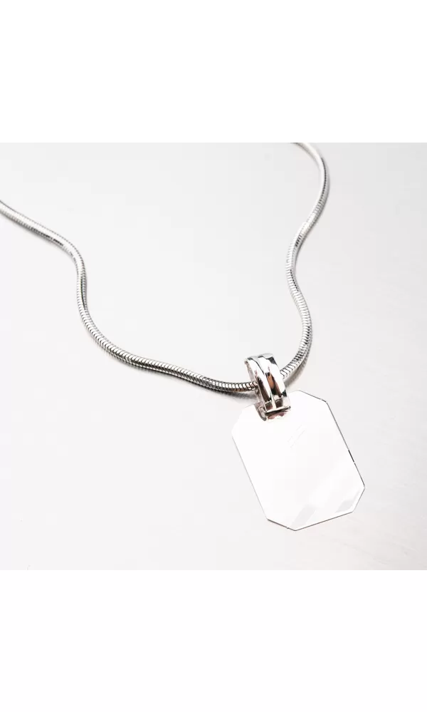Moderný prívesok v tvare doštičky je vyrobený z bieleho štrnásťkarátového zlata 585/1000 v lesklej povrchovej úprave. Predná strana zlatej doštičky… Celý popis