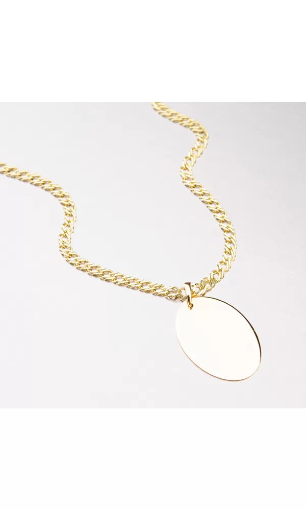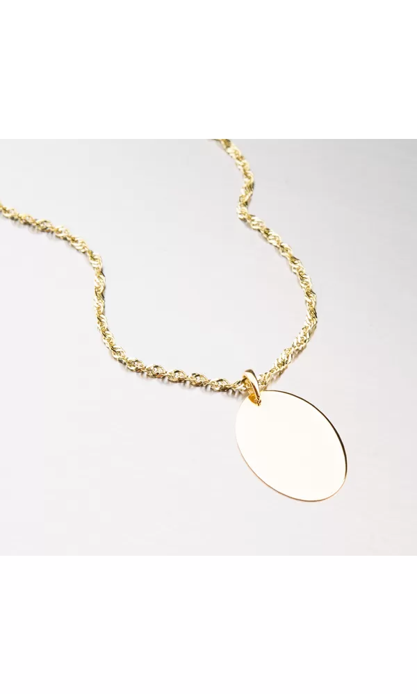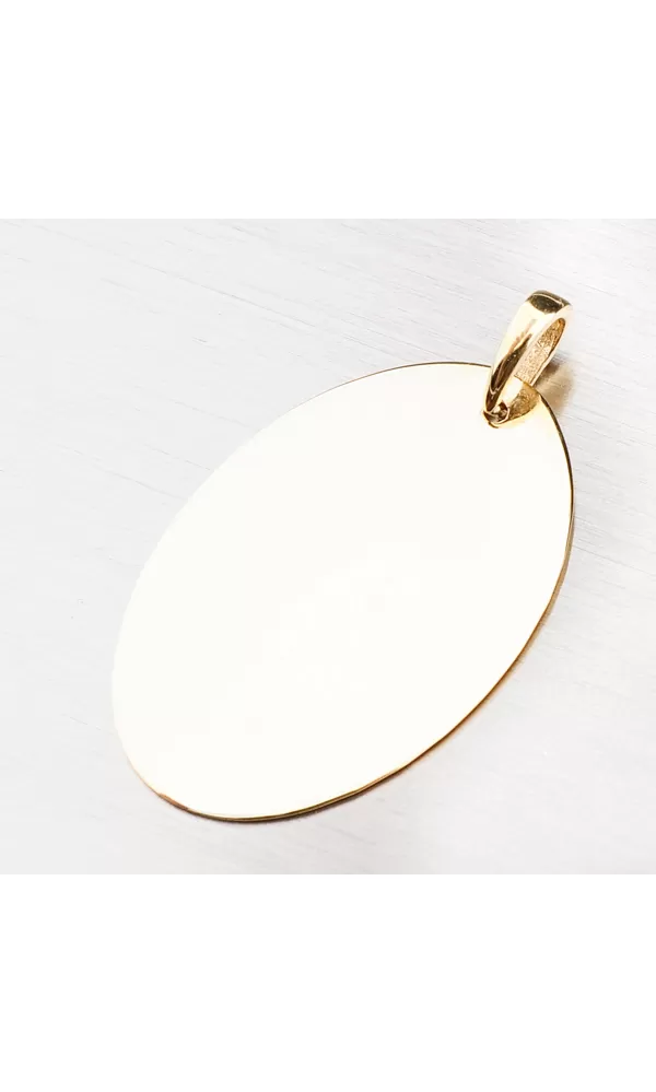 Moderný prívesok v tvare doštičky je vyrobený zo žltého štrnáctikarátového zlata 585/1000 v lesklej povrchovej úprave. Doštička je v oválnom tvare. prosím uveďte v kolónke špeciálne požiadavky.