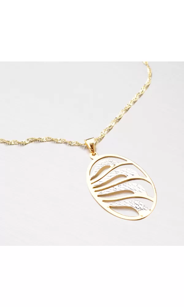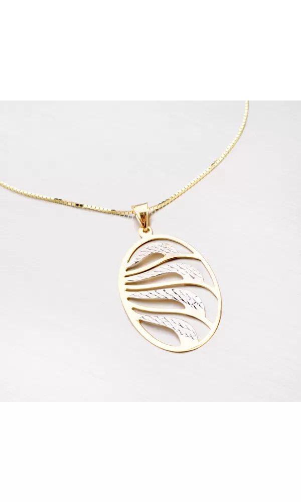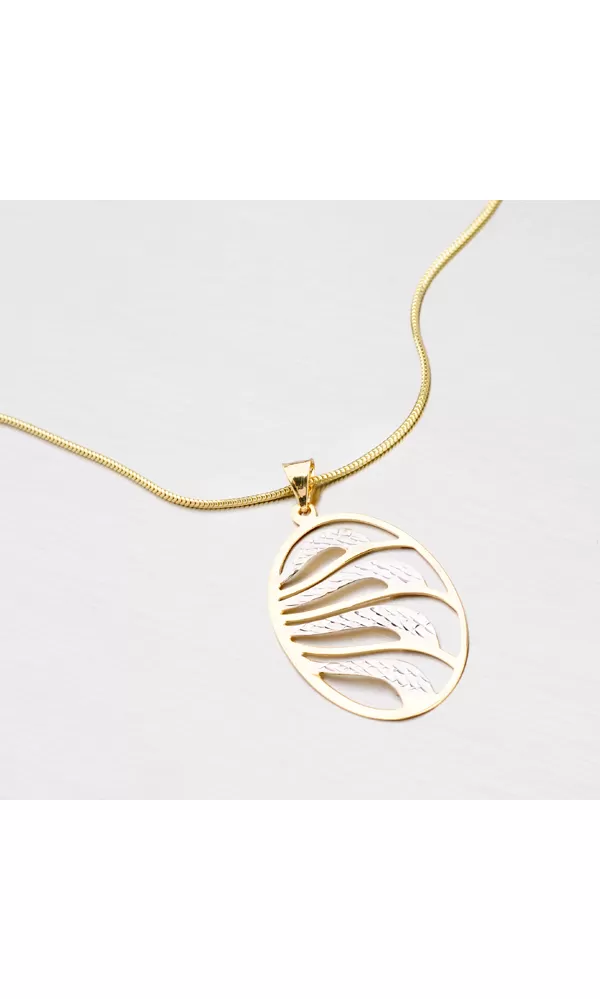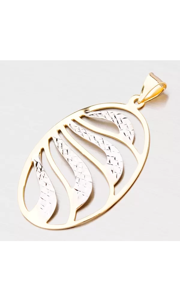 Oválny prívesok zo zlata zdobený gravírovaním zaujme vaše okolie, nech už budete kdekoľvek. Prívesok je vyrobený zo žltého štrnástich karátového zlata s rýdzosťou 585/1000 v kombinácii žltej a bielej farby. Obrys je spoločne so slabými vlnkami v zlatej farbe s lesklým povrchom. Širšie vlnky sú v bielej farbe a zdobené gravírovaním.