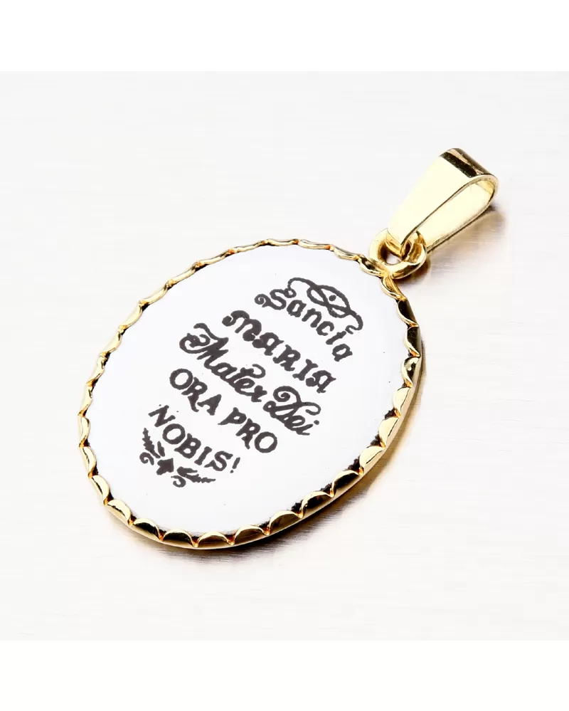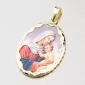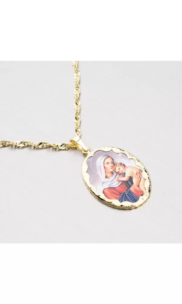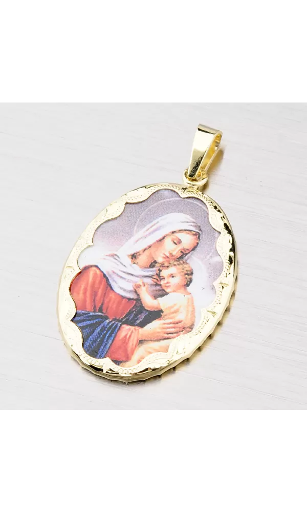Oválny prívesok s obrázkom bábiky Márie je vyrobený zo žltého štrnásťkarátového zlata 585/1000 v lesklej povrchovej úprave. Prívesok je zdobený ručným gravírovaním. Boží, pros za nás.