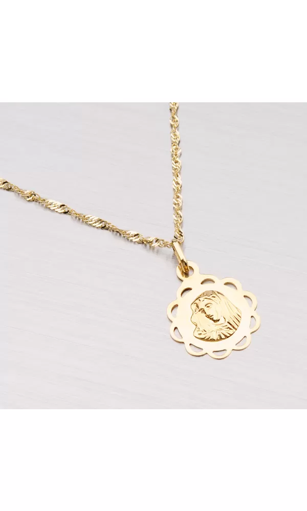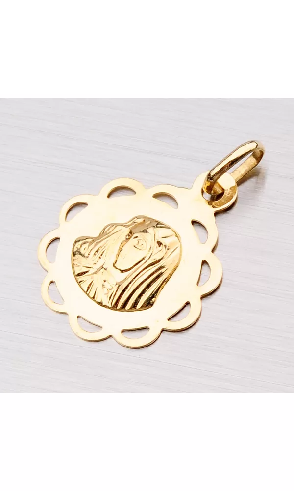 Prívesok - Madonka zo žltého štrnásťkarátového zlata 585/1000 v lesklej povrchovej úprave. Motív prívesku je plastický a je zobrazený v ozdobnom… Celý popis