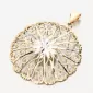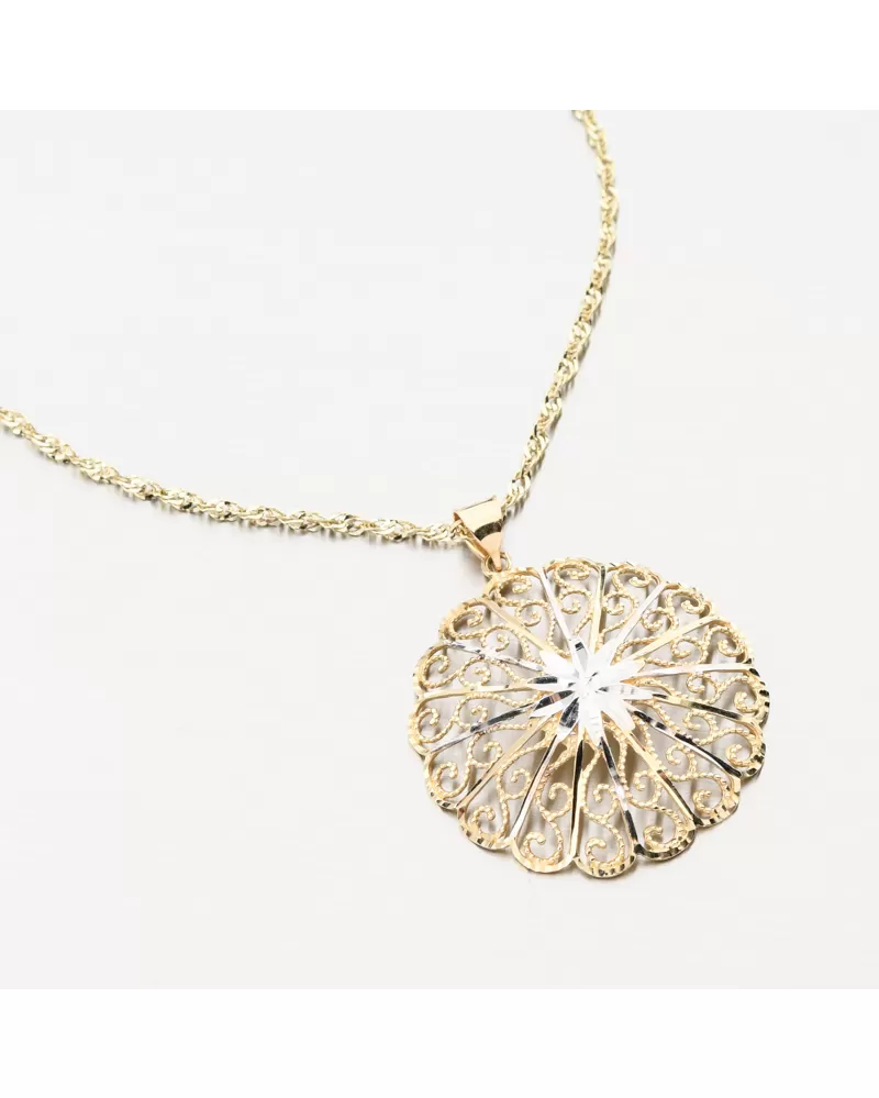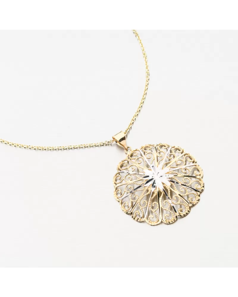 V tomto zlatom prívesku si môžete všimnúť krásnu a jedinečnú kombináciu vzoru filigrálneho a diamantového strihu. Urobte si spokojný s okrúhlym príveskom, ktorý rozsvieti dekolt a priláka výhľady na okolie. Jeho dizajn nie je len pohľad. Tento prívesok sa vyrába pomocou presných techník filigrácie. Je to starodávna technika zdobenia šperkov, ktorá pozostáva z krútenia a spájkovania jemných drôtov drahých kovov. Okrem toho je prívesok zdobený bielou farbou zlata.