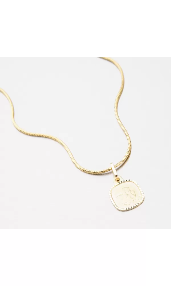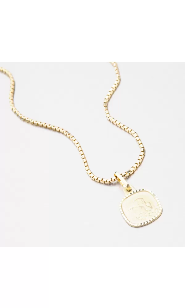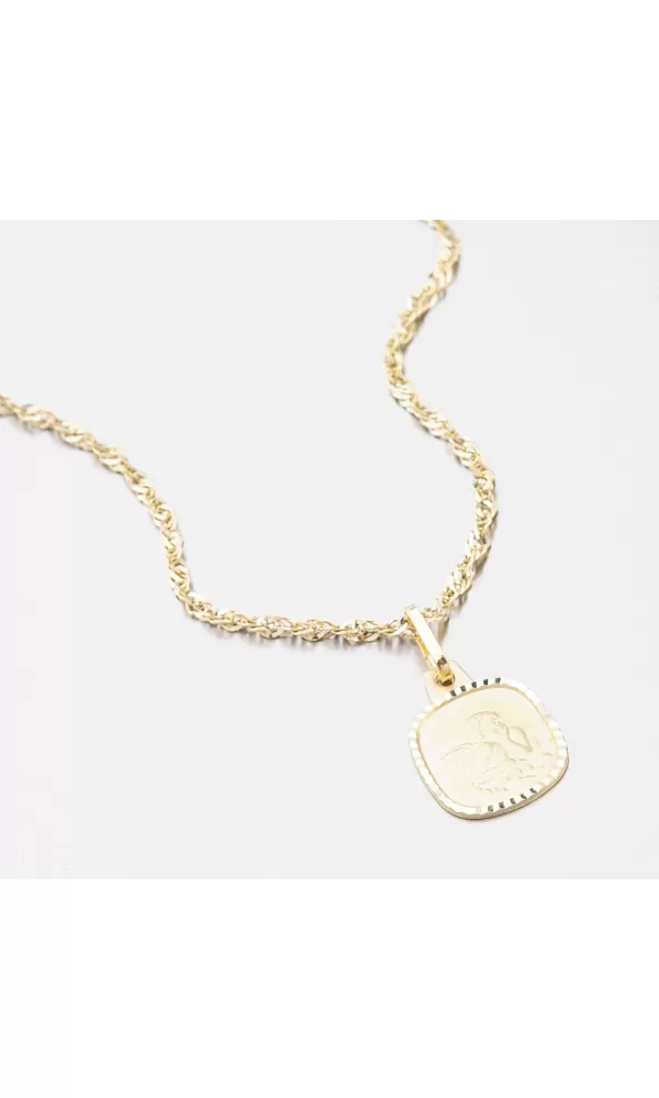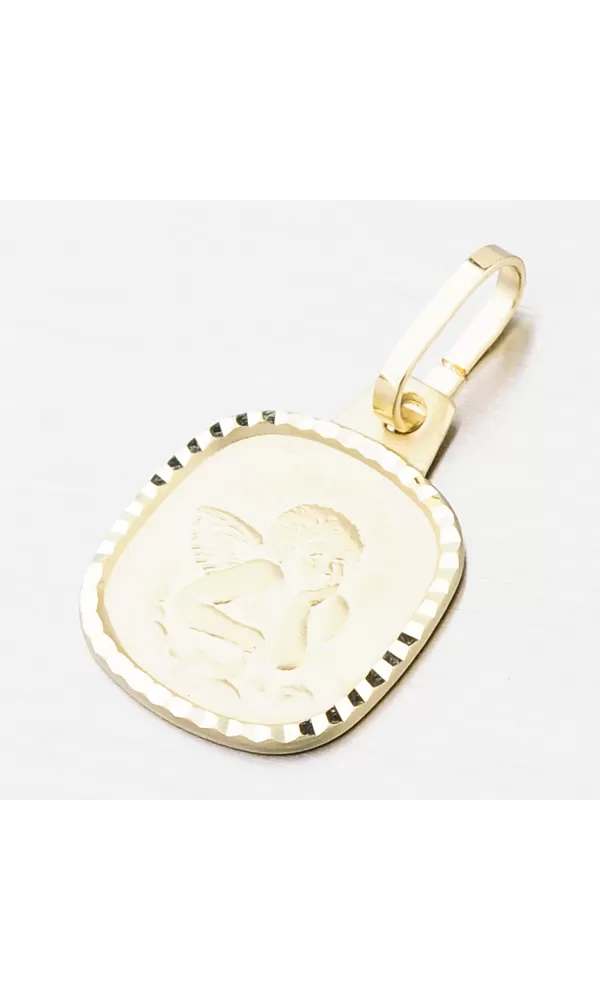 Jemný prívesok v hranatom tvare je zdobený anjelikom v matnej povrchovej úprave. Okolo anjelika po okrajoch prívesku je zdobenie vo forme gravírovania za pomoci diamantového hrotu, vďaka ktorému získa šperk maximálny lesk a brilanciu zo všetkých uhlov. Prívesok je vyrobený zo žltého štrnásťkarátového zlata 585/1000 v lesklej povrchovej úprave.