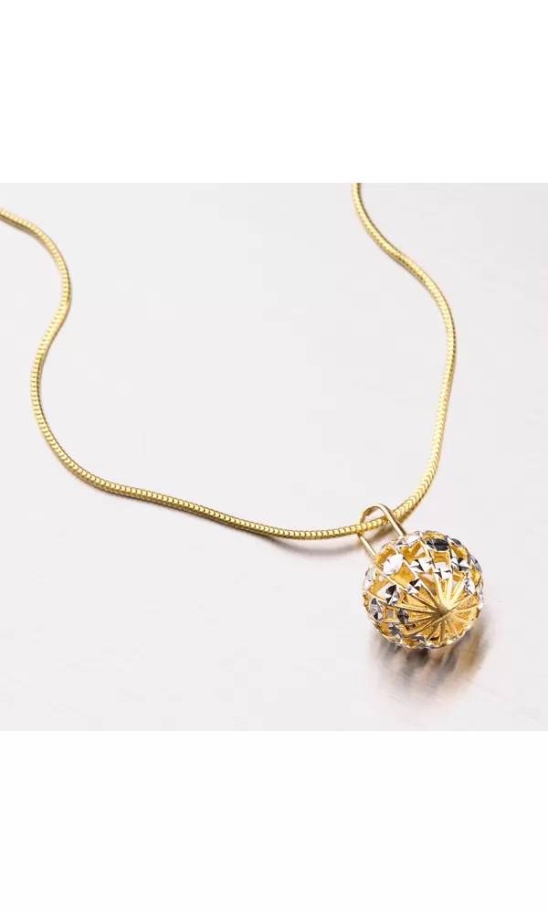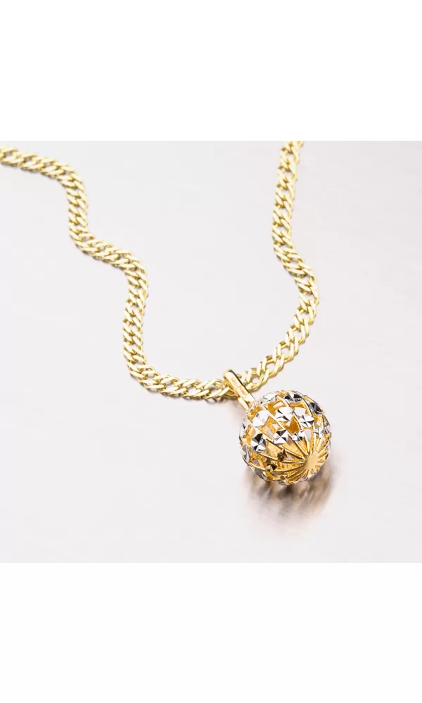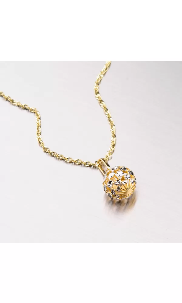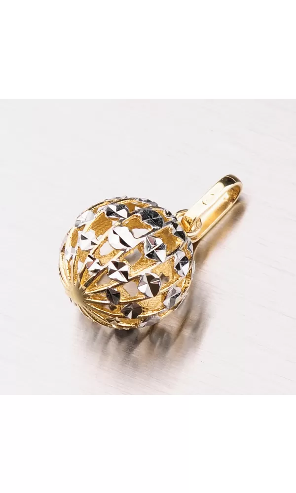 Prívesok je vyrobený zo žltého štrnásťkarátového zlata 585/1000. Zlatý prívesok je tvorený prepletanou guličkou, ktorá je ešte navyše zdobená bielou farbou zlata a gravírovaním.
