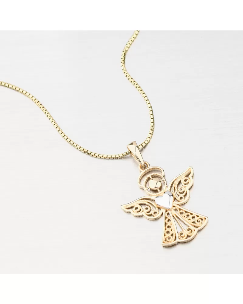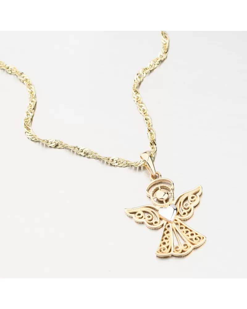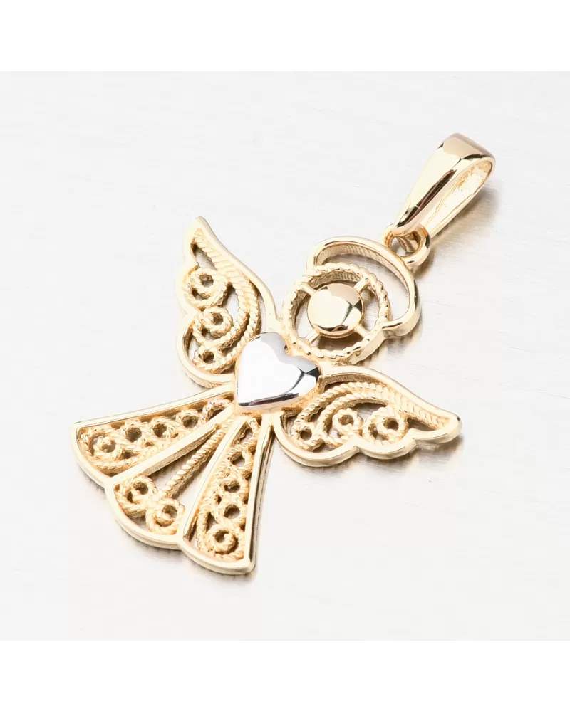 Nádherný zlatý prívesok v tvare anjela. Anjelik je prepracovaný do toho najmenšieho detailu. Prívesok vyniká zdobenými časťami, ktoré dodáva tú správnu jedinečnosť. V samotnom strede anjela je lesklé srdce v bielej farbe zlata. Potešte druhých týmto nádherným symbolickým šperkom.