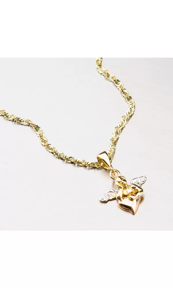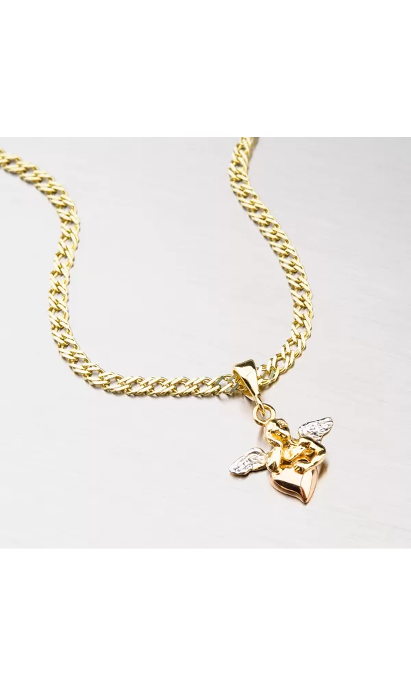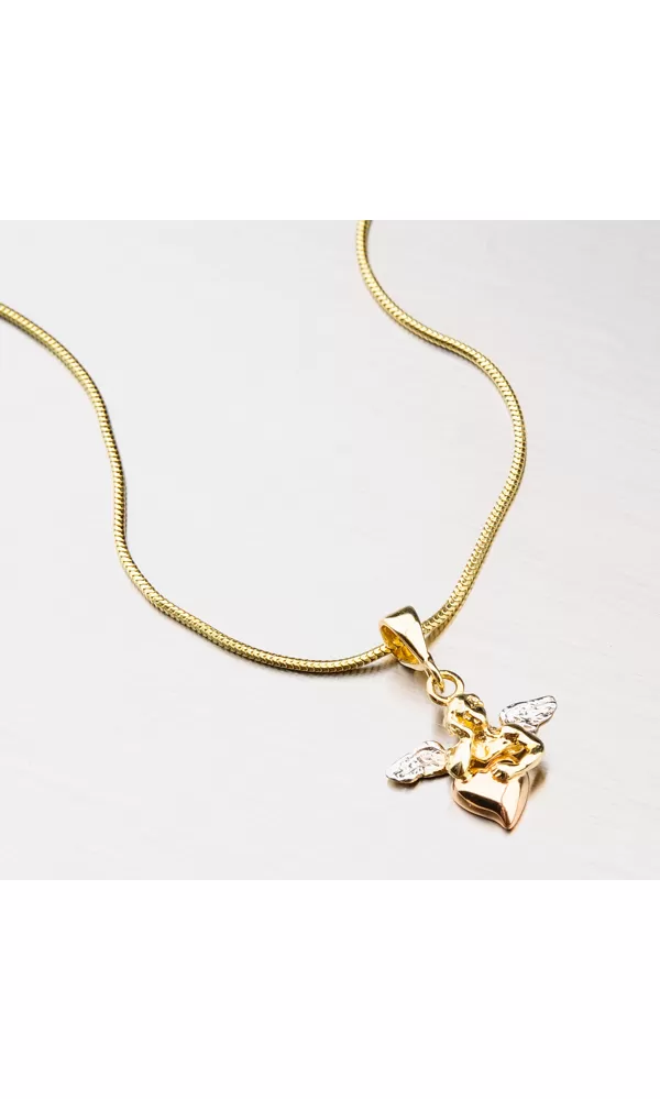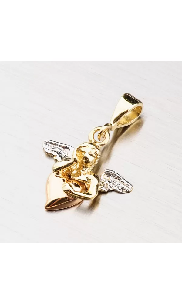 Prívesok je vyrobený zo žltého štrnásťkarátového zlata 585/1000. Nežný prívesok v tvare anjelika vás prekvapí precíznym spracovaním. Anjelik v ruke drží srdce v lesklej povrchovej úprave av ružovej farbe zlata. Zvýraznené sú krídla, ktoré majú bielu farbu zlata. Prívesok bude vyzerať skvele na krku ale dá sa navliecť aj na náramok alebo s ním môžete ozdobiť členok.